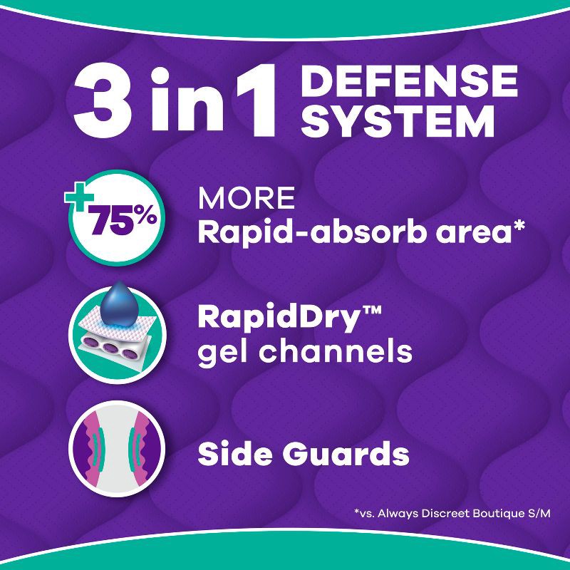 - 75% MORE RAPID-ABSORB AREA*: for full coverage confidence and protection (*vs. Always Discreet Boutique S/M)