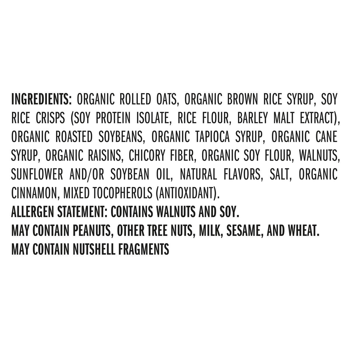 INGREDIENTS: ORGANIC ROLLED OATS, ORGANIC BROWN RICE SYRUP, SOY RICE CRISPS (SOY PROTEIN ISOLATE, RICE FLOUR, BARLEY MALT EXTRACT), ORGANIC ROASTED SOYBEANS, ORGANIC TAPIOCA SYRUP, ORGANIC CANE SYRUP,…