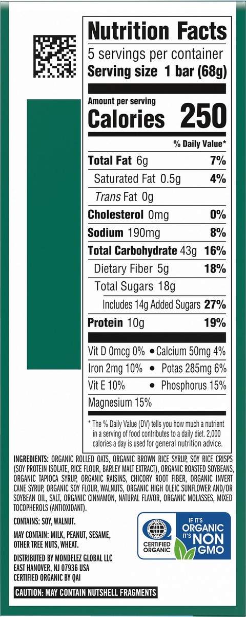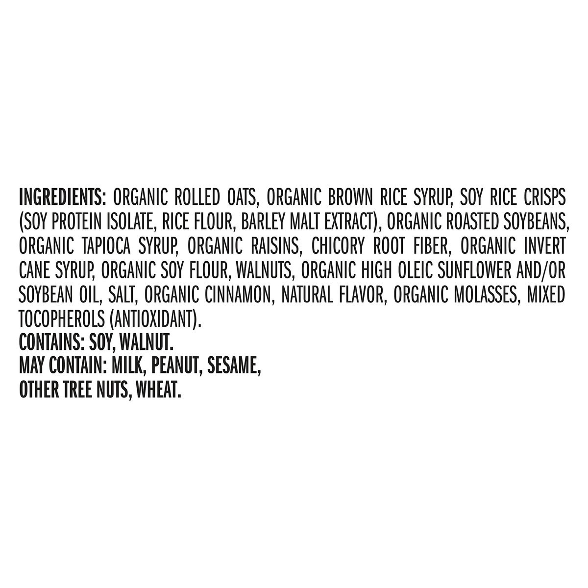 Organic Rolled Oats, Organic Brown Rice Syrup, Soy Rice Crisps (Soy Protein Isolate, Rice Flour, Barley Malt Extract), Organic Roasted Soybeans, Organic Tapioca Syrup, Organic Raisins, Chicory Root Fi…