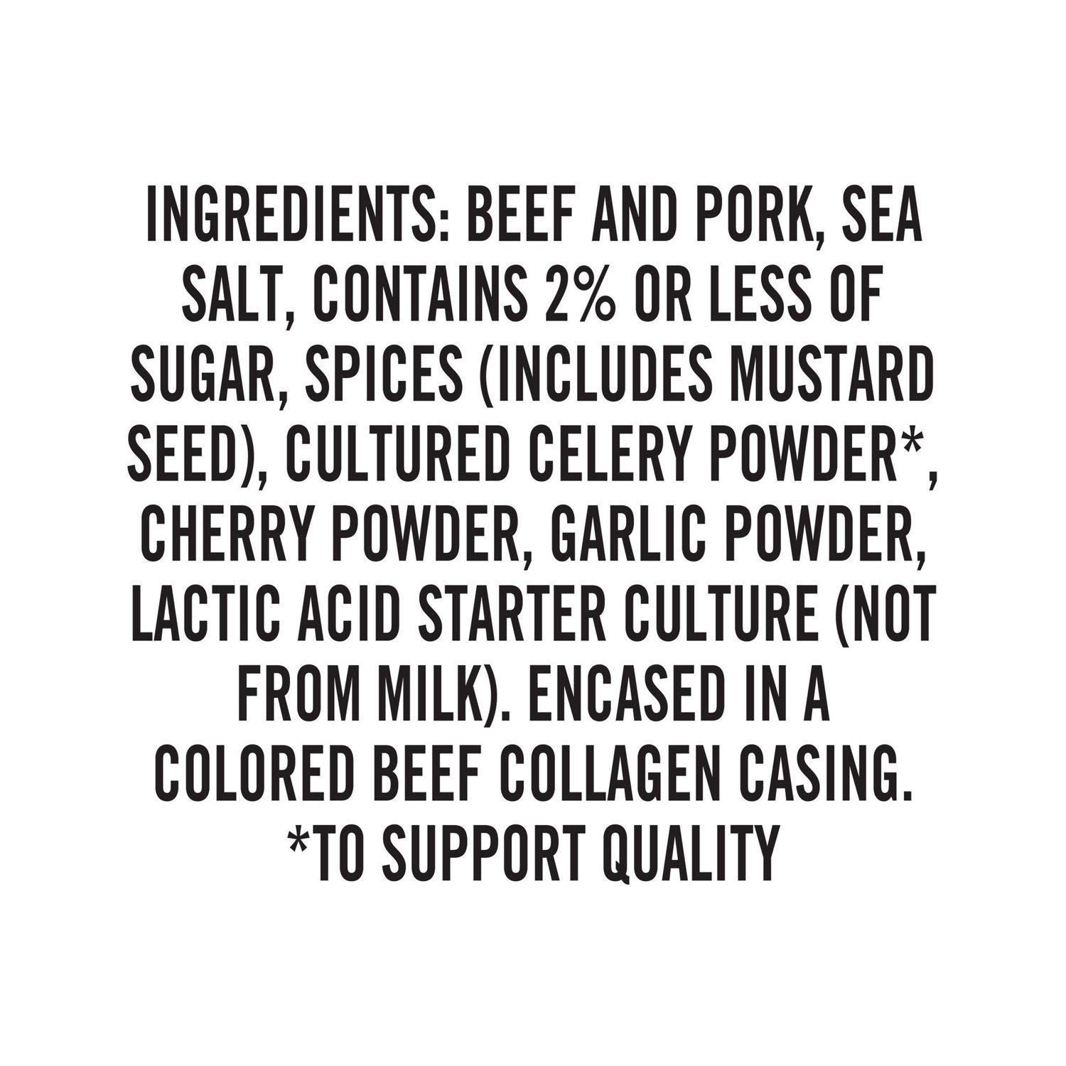 Beef and Pork, Sea Salt, Contains 2% or Less of Sugar, Spices (Includes Mustard Seed), Cultured Celery Powder (Ingredient to Support Quality), Cherry Powder, Garlic Powder, Lactic Acid Starter Culture…