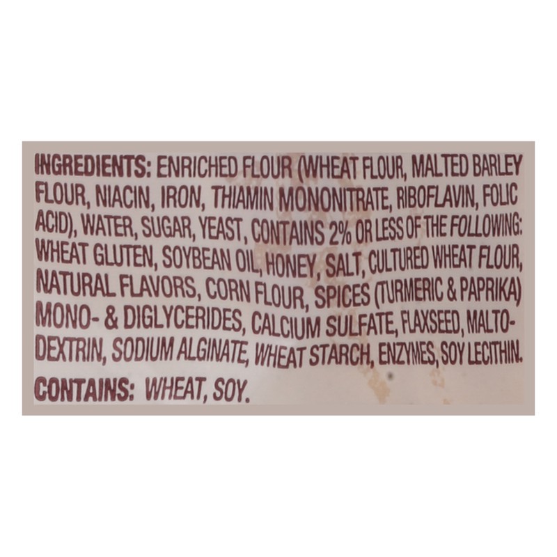Enriched Flour (Wheat Flour, Malted Barley Flour, Niacin, Iron, Thiamin Mononitrate, Riboflavin, Folic Acid), Water, Sugar, Yeast, Contains 2% or Less of the Following: Wheat Gluten, Soybean Oil, Hone…