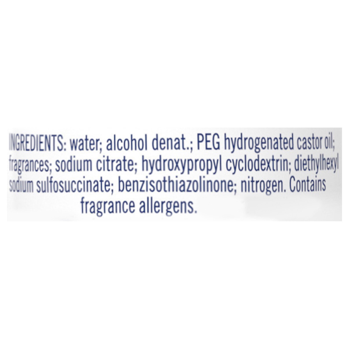 Water; Alcohol Denat.; PEG Hydrogenated Castor Oil; Fragrances; Sodium Citrate; Hydroxypropyl Cyclodextrin; Diethylhexyl Sodium Sulfosuccinate; Benzisothiazolinone; Nitrogen.