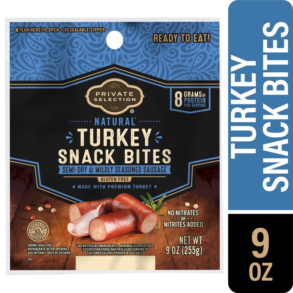 Private Selection® Turkey Snack Bites offer bite-sized amusement for your palate, with a semi-dry & mildly seasoned sausage allure. With ingredients including turkey, sea salt, spices, and sweetened c…