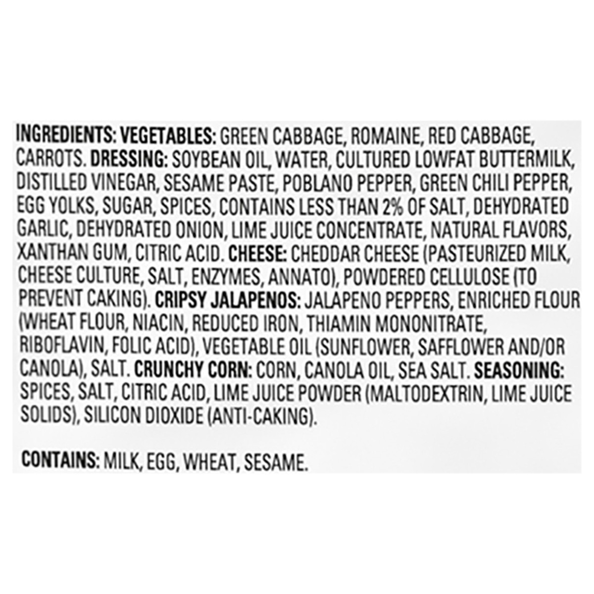 Vegetables: Green Cabbage, Romaine, Red Cabbage, Carrots, Dressing: Soybean Oil, Water, Cultured Lowfat Buttermilk, Distilled Vinegar, Sesame Paste, Poblano Pepper, Green Chili Pepper, Egg Yolks, Suga…