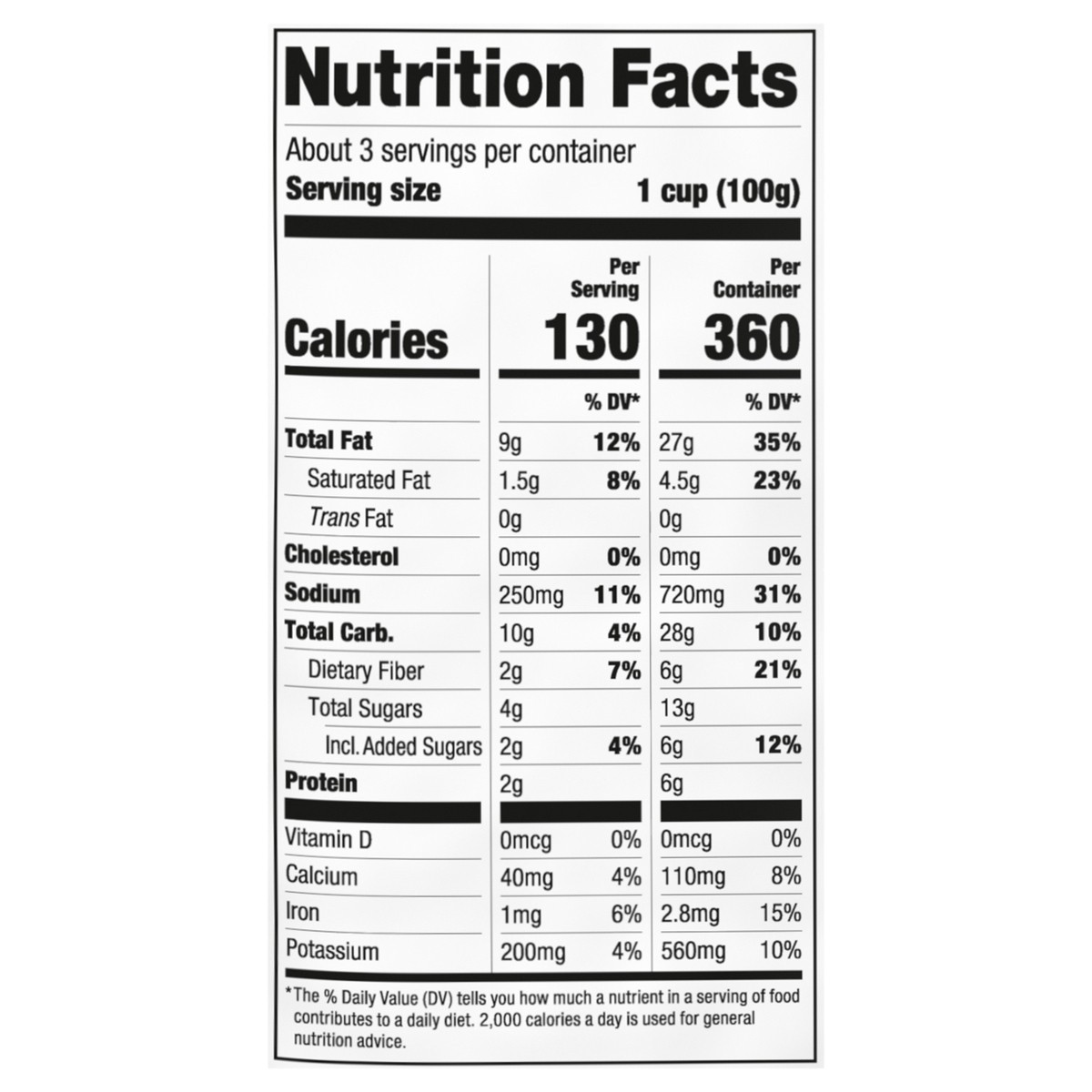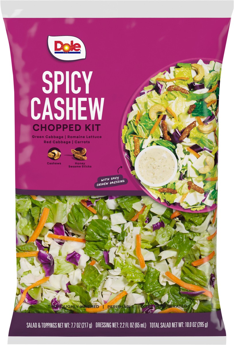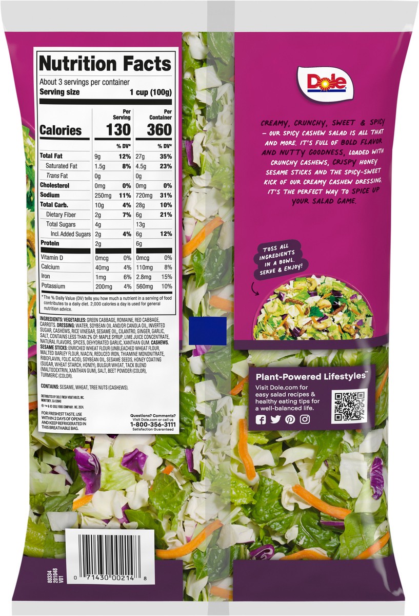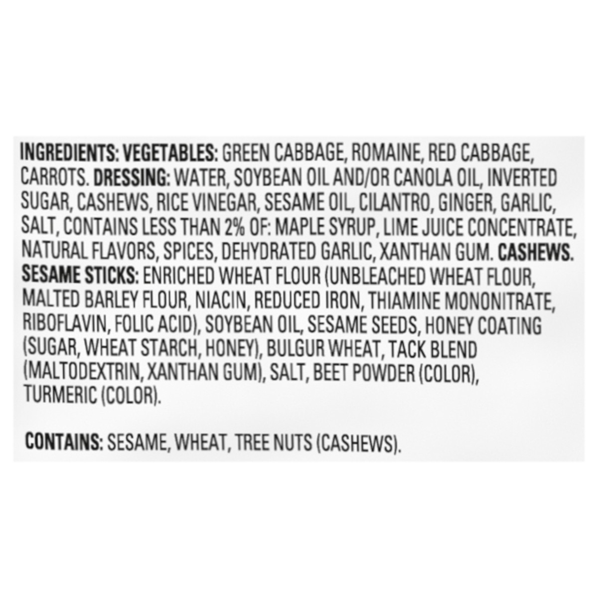 Vegetables: Green Cabbage, Romaine, Red Cabbage, Carrots, Dressing: Water, Soybean Oil and/or Canola Oil, Inverted Sugar, Cashews, Rice Vinegar, Sesame Oil, Cilantro, Ginger, Garlic, Salt, Contains Le…