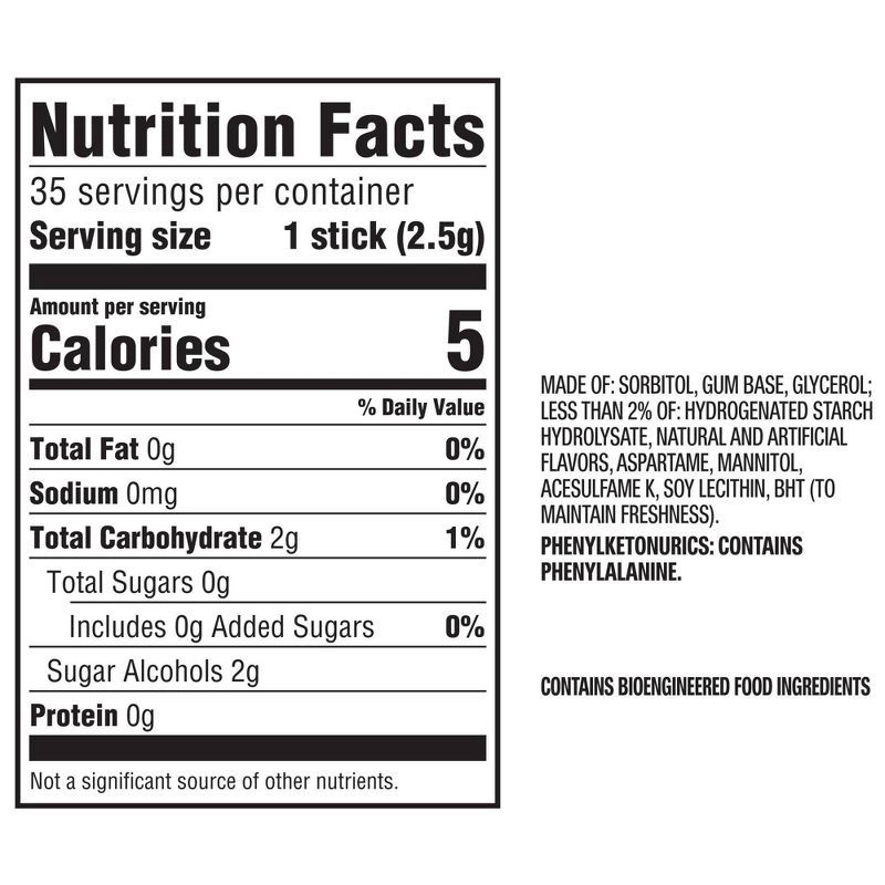 SORBITOL, GUM BASE, GLYCEROL; LESS THAN 2% OF: NATURAL AND ARTIFICIAL FLAVORS, HYDROGENATED STARCH HYDROLYSATE, ASPARTAME, MANNITOL, ACESULFAME K, SOY LECITHIN, BHT (TO MAINTAIN FRESHNESS).