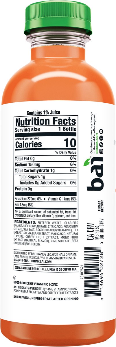 Filtered Water, Clarified Orange Juice Concentrate, Citric Acid, Potassium Citrate, Sea Salt, Ascorbic Acid (Vitamin C), Tea Extract, Stevia Leaf Extract, Malic Acid, Natural Flavors, Coffee Fruit Ext…