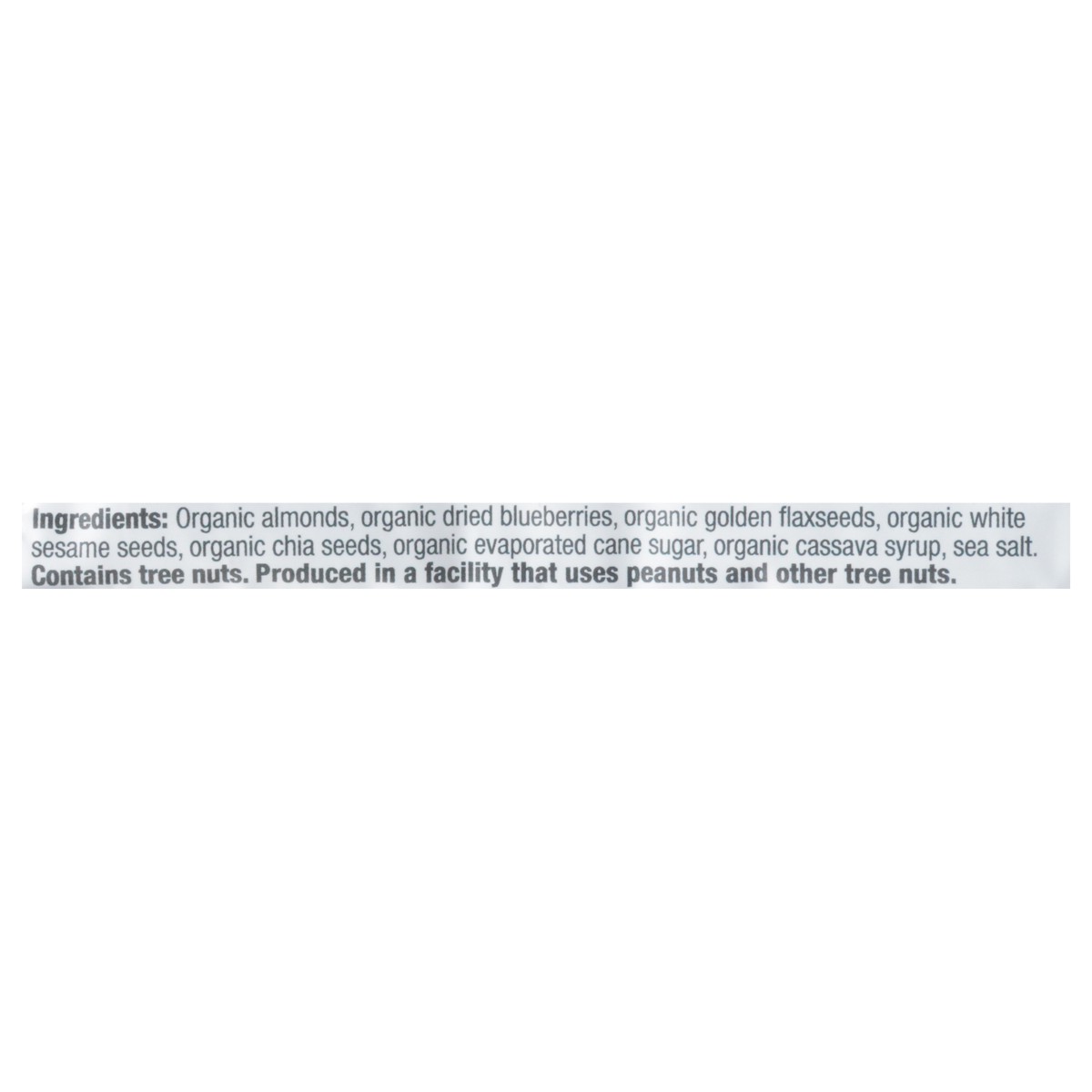 Organic Almonds, Organic Dried Blueberries, Organic Golden Flaxseeds, Sesame Seeds, Organic Chia Seeds, Organic Evaporated Cane Sugar, Organic Cassava Syrup, Sea Salt.