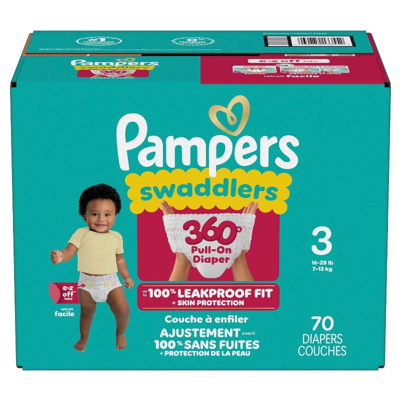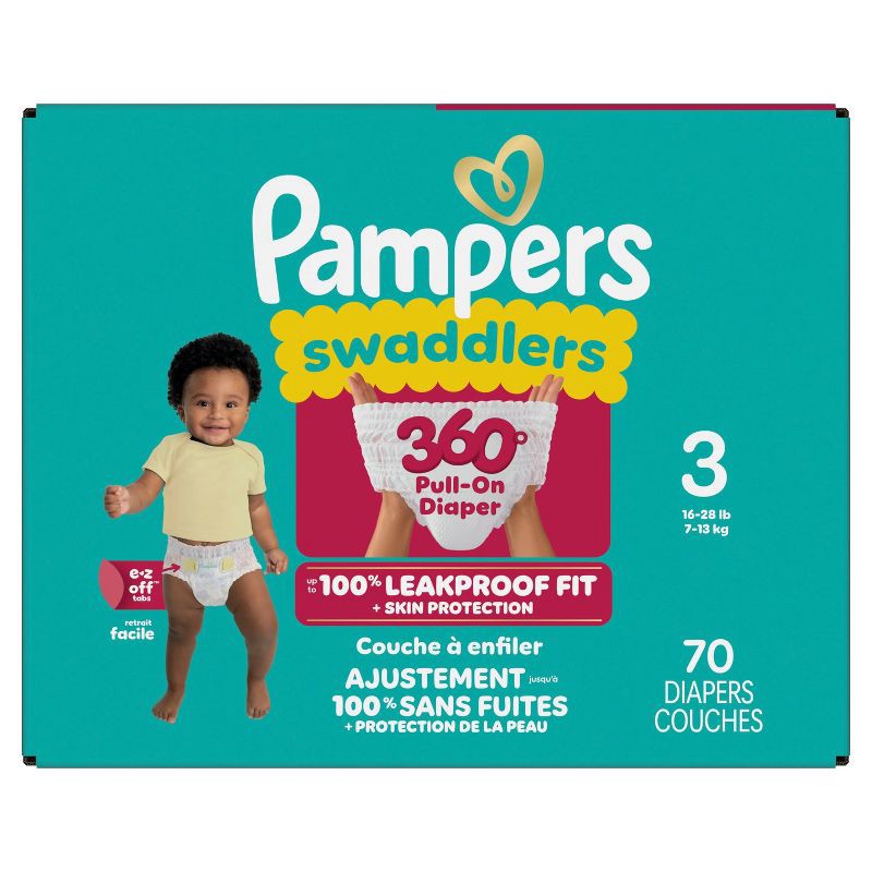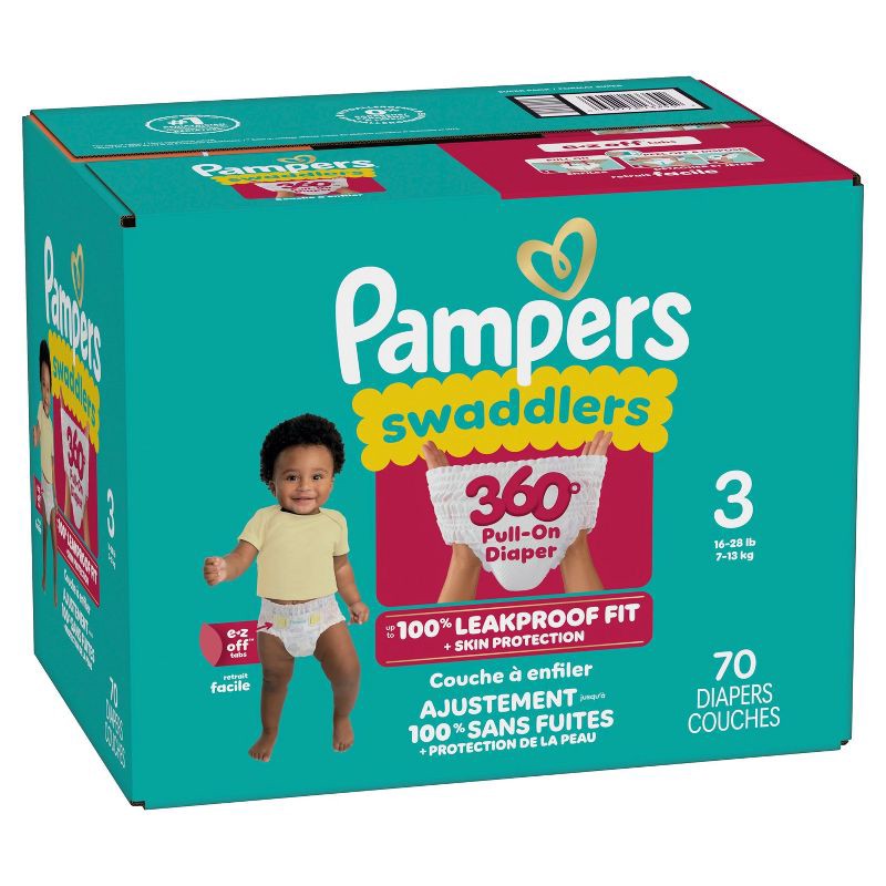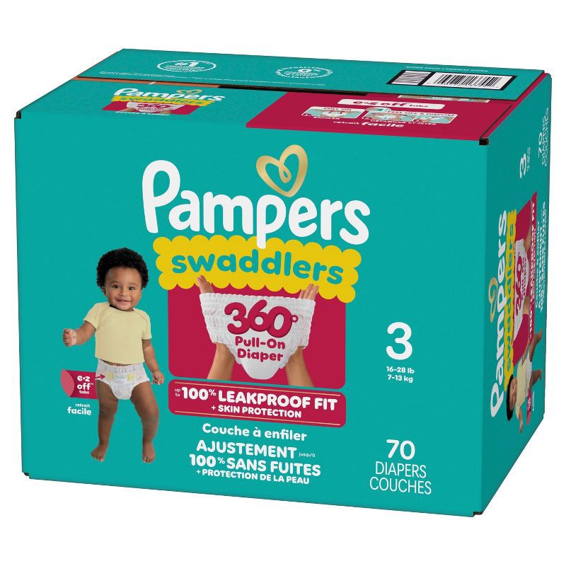 The Pampers Swaddlers 360 degrees comfy, dry protection you know and love just got updated-with E-Z Off tabs for even easier changes. Featuring ultrasoft absorbent layers and Dual-Leak Guard Barriers …
