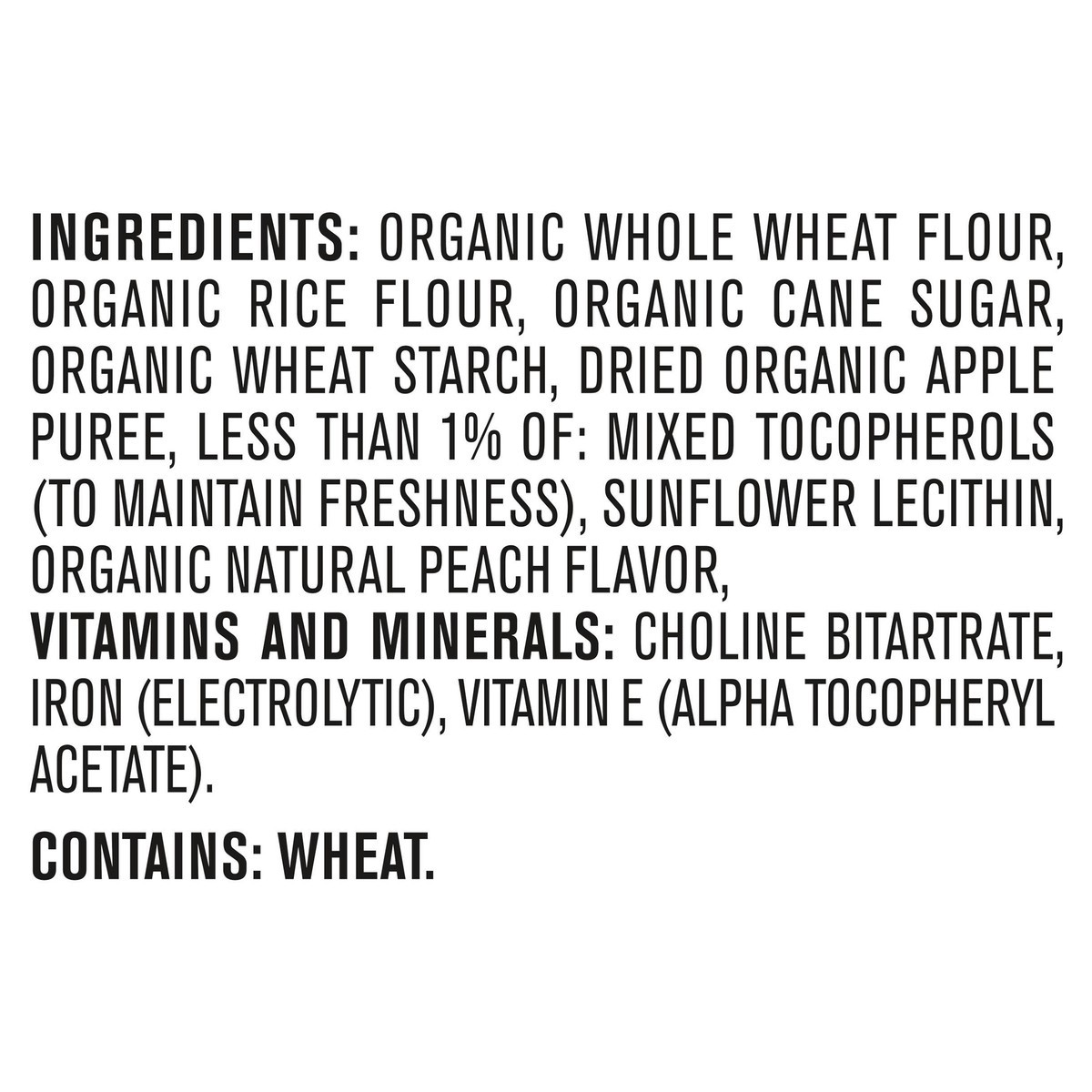 Organic Whole Wheat Flour, Organic Rice Flour, Organic Cane Sugar, Organic Wheat Starch, Dried Organic Apple Puree, Less than 1% of: Mixed Tocopherols (to Maintain Freshness), Sunflower Lecithin, Orga…