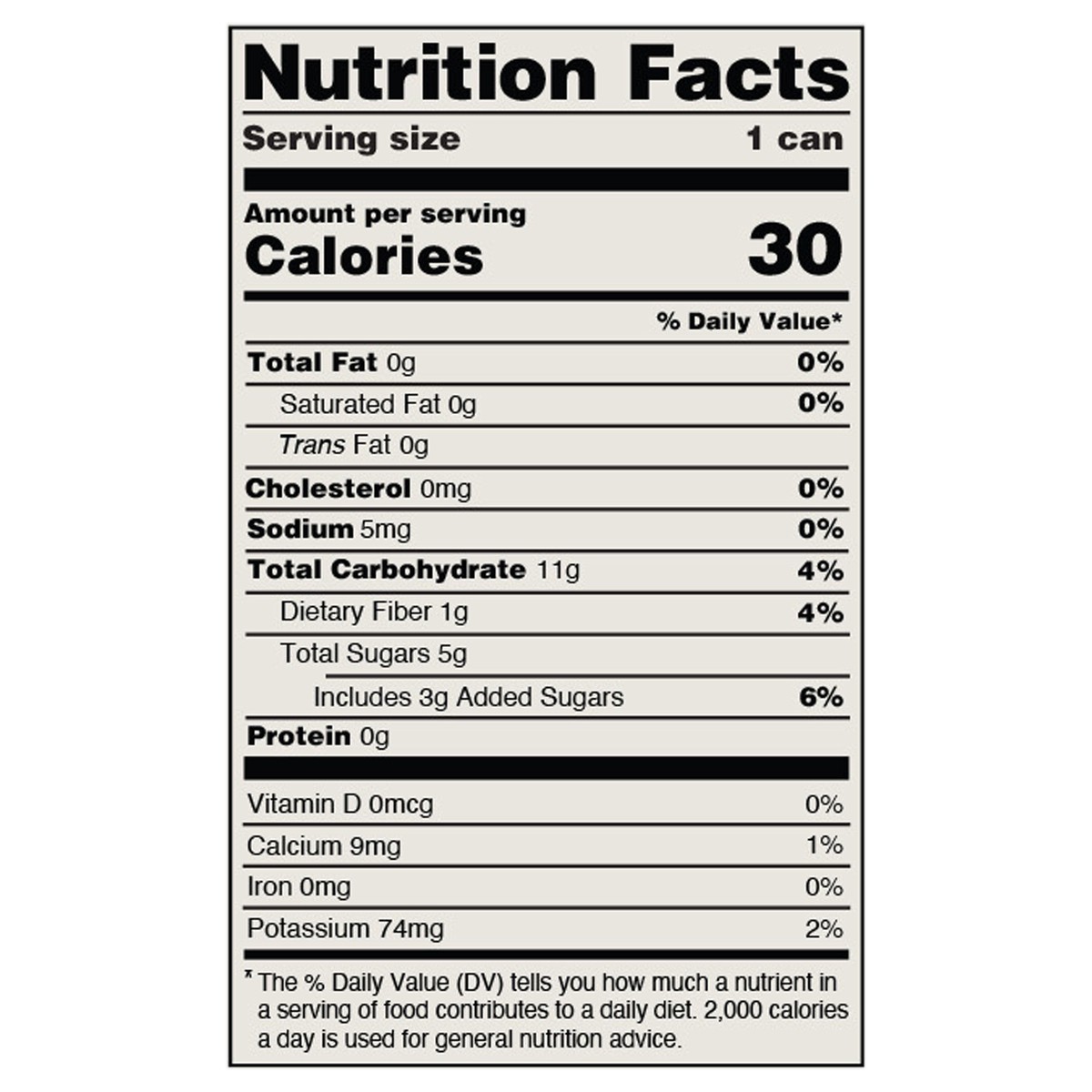 Carbonated Filtered Water, Organic Passion Fruit Juice Concentrate, Organic Erythritol, Organic Cane Sugar, Organic Flavors, Organic Gum Acacia, Organic Lemon Balm Extract, Organic Tangerine Juice Con…