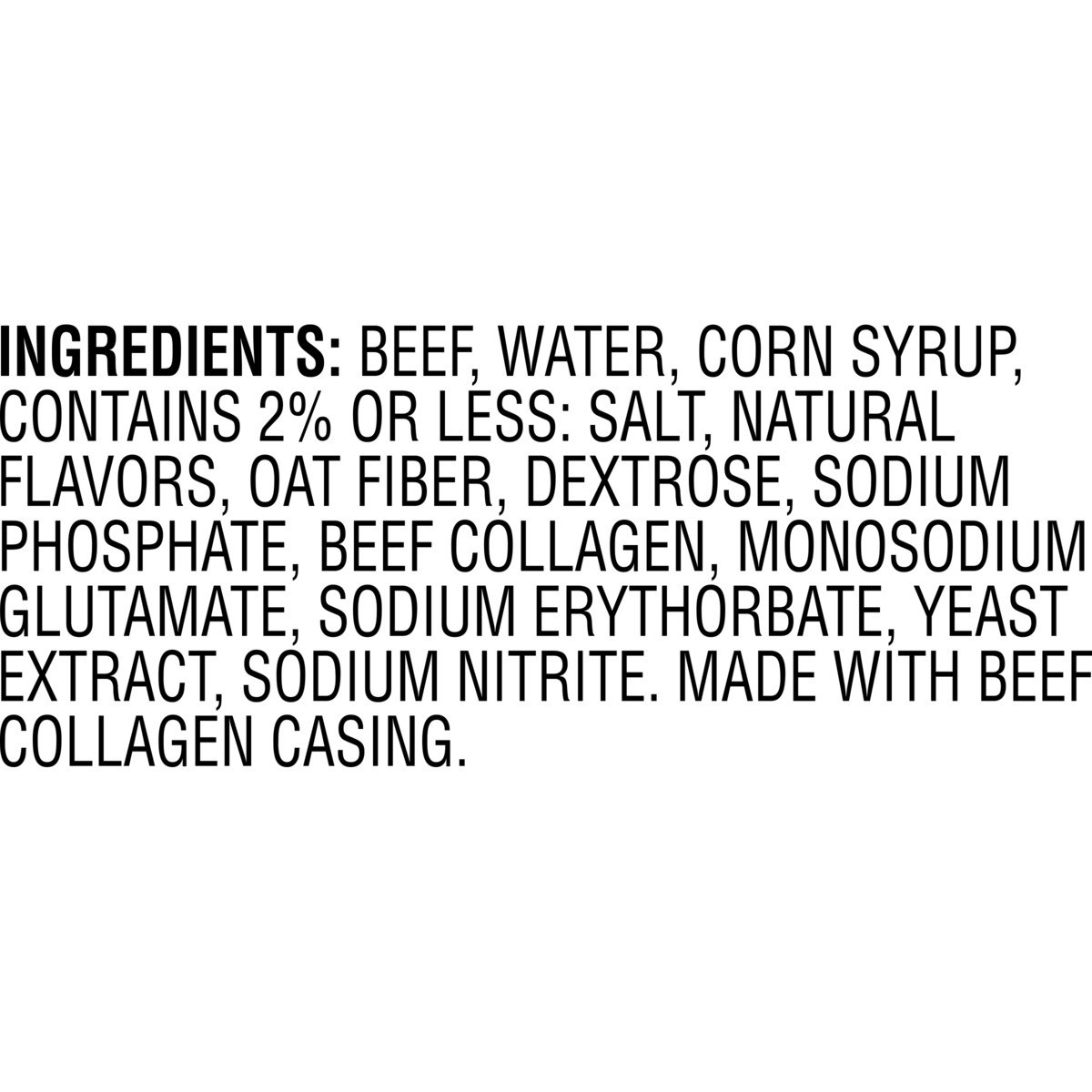 Beef, Water, Corn Syrup, Contains 2% or Less: Salt, Natural Flavors, Oat Fiber, Dextrose, Sodium Phosphate, Beef Collagen, Monosodium Glutamate, Sodium Erythorbate, Yeast Extract, Sodium Nitrite. Made…