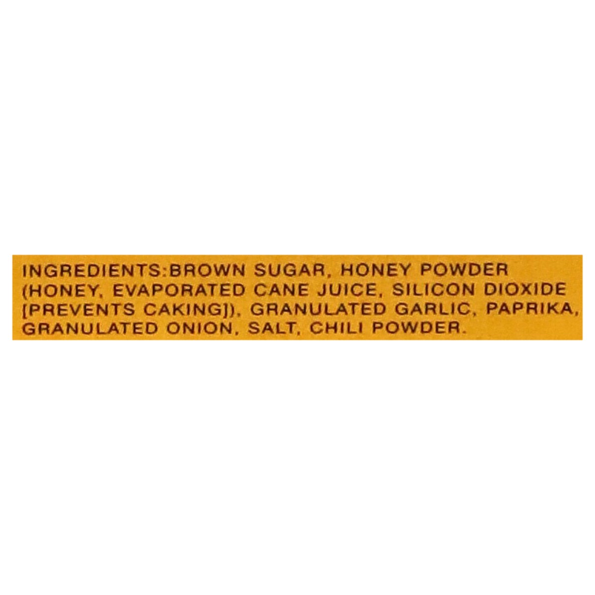 Brown Sugar, Honey Powder (Honey, Evaporated Cane Juice, Silicon Dioxide [Prevents Caking]), Granulated Garlic, Paprika, Granulated Onion, Salt, Chili Powder.