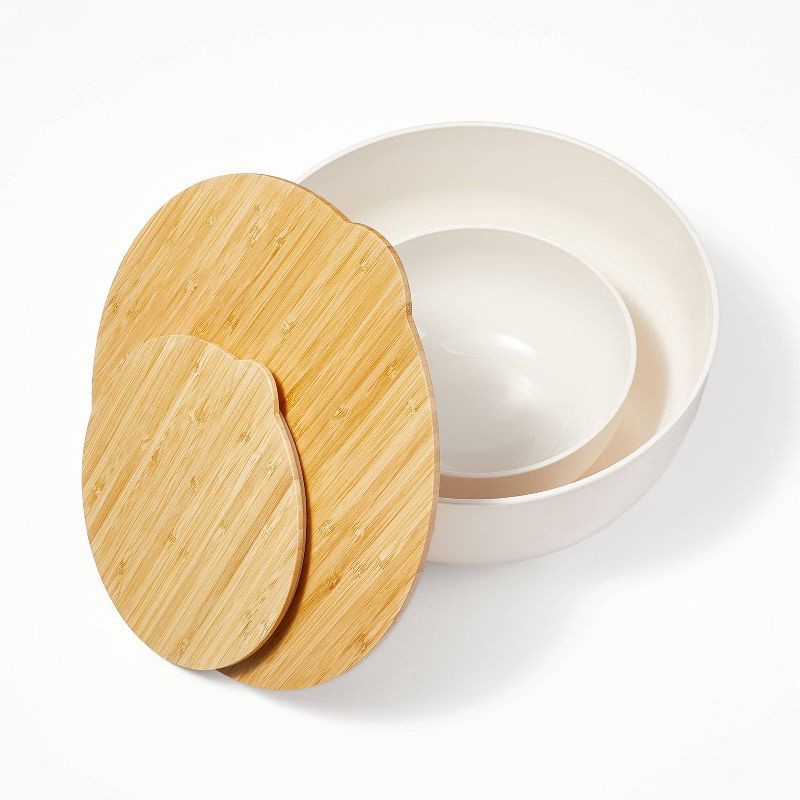Store leftovers, whisk eggs or serve a side dish with ease using the Plastic Mixing Bowl Set with Bamboo Lids from Figmint™. This set of mixing bowls comes with two cream bowls made of recycled plasti…