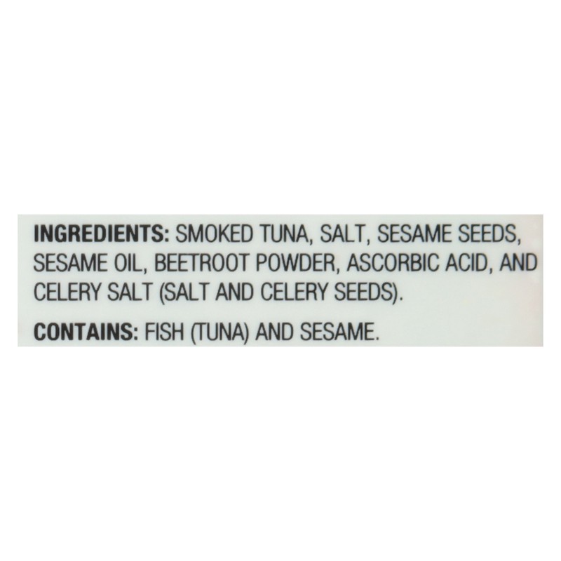 Smoked Tuna, Salt, Sesame Seeds, Sesame Oil, Beetroot Powder, Ascorbic Acid, and Celery Salt (Salt and Celery Seeds).