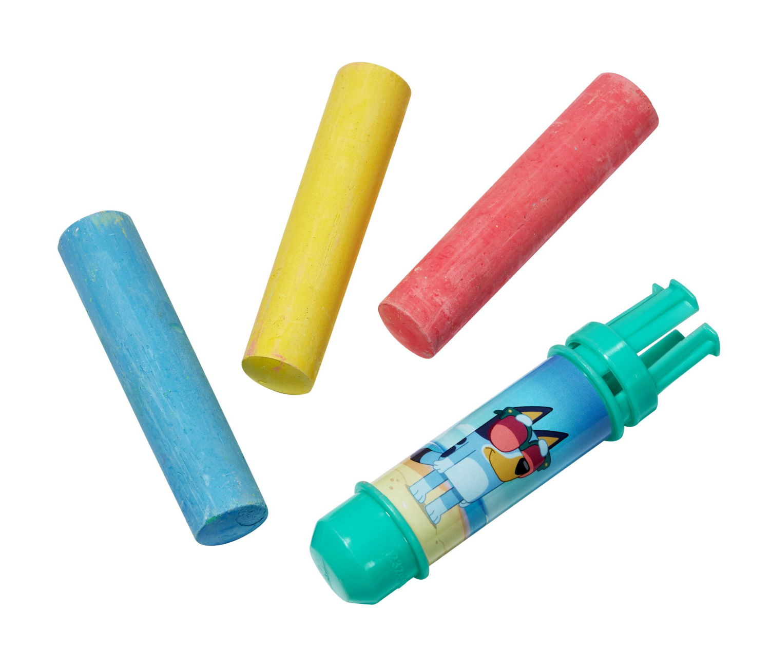 Hours of outdoor fun! 3 Bright colored pieces of chalk and 1 Bluey character holder, featuring Bluey character graphics, to keep hands clean from chalk dust.