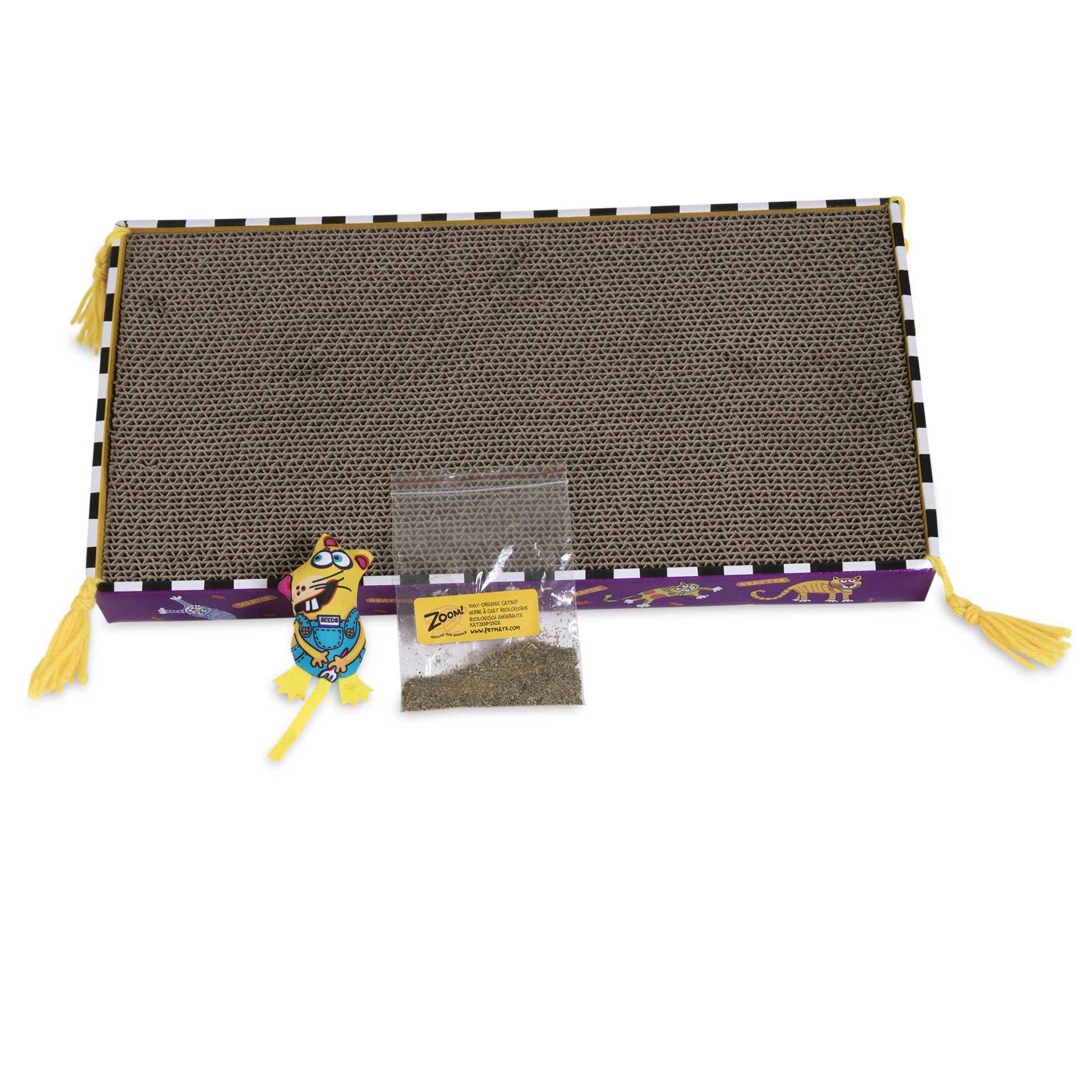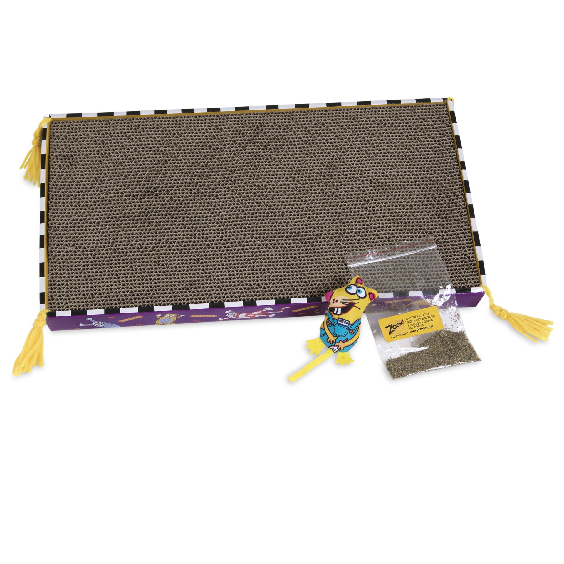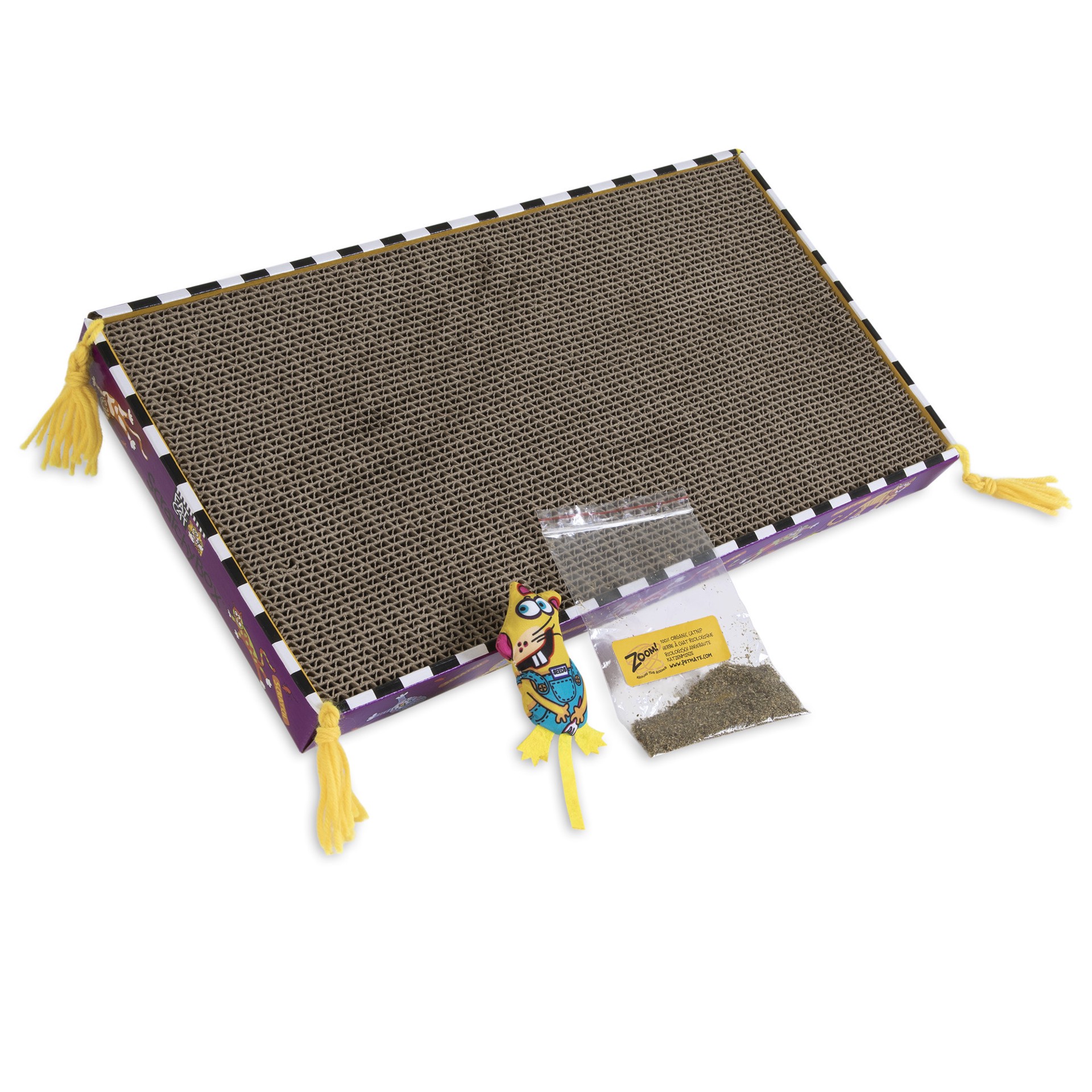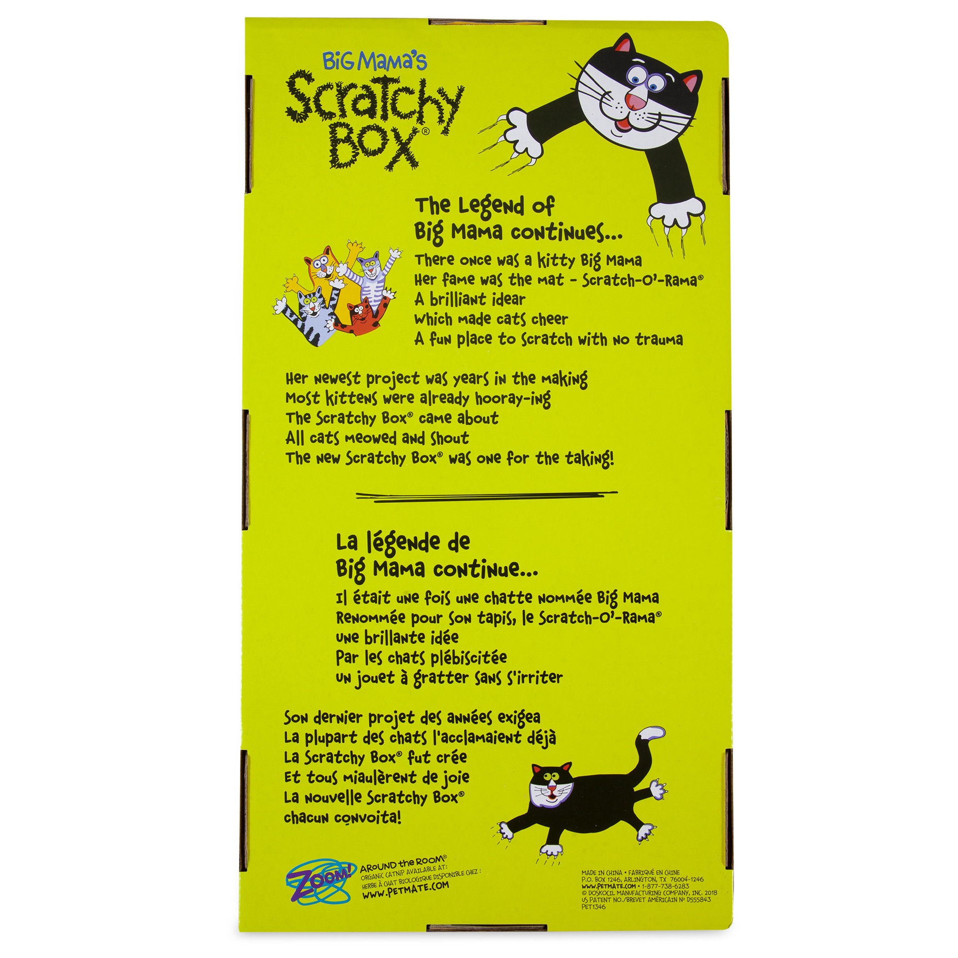 Free cat toy! A scratching solution for you and your cat! Saves furniture. Zoom! Around the room. 100% organic catnip. www.petmate.com. Organic catnip inside. Scratch. The legend of big mama continues…