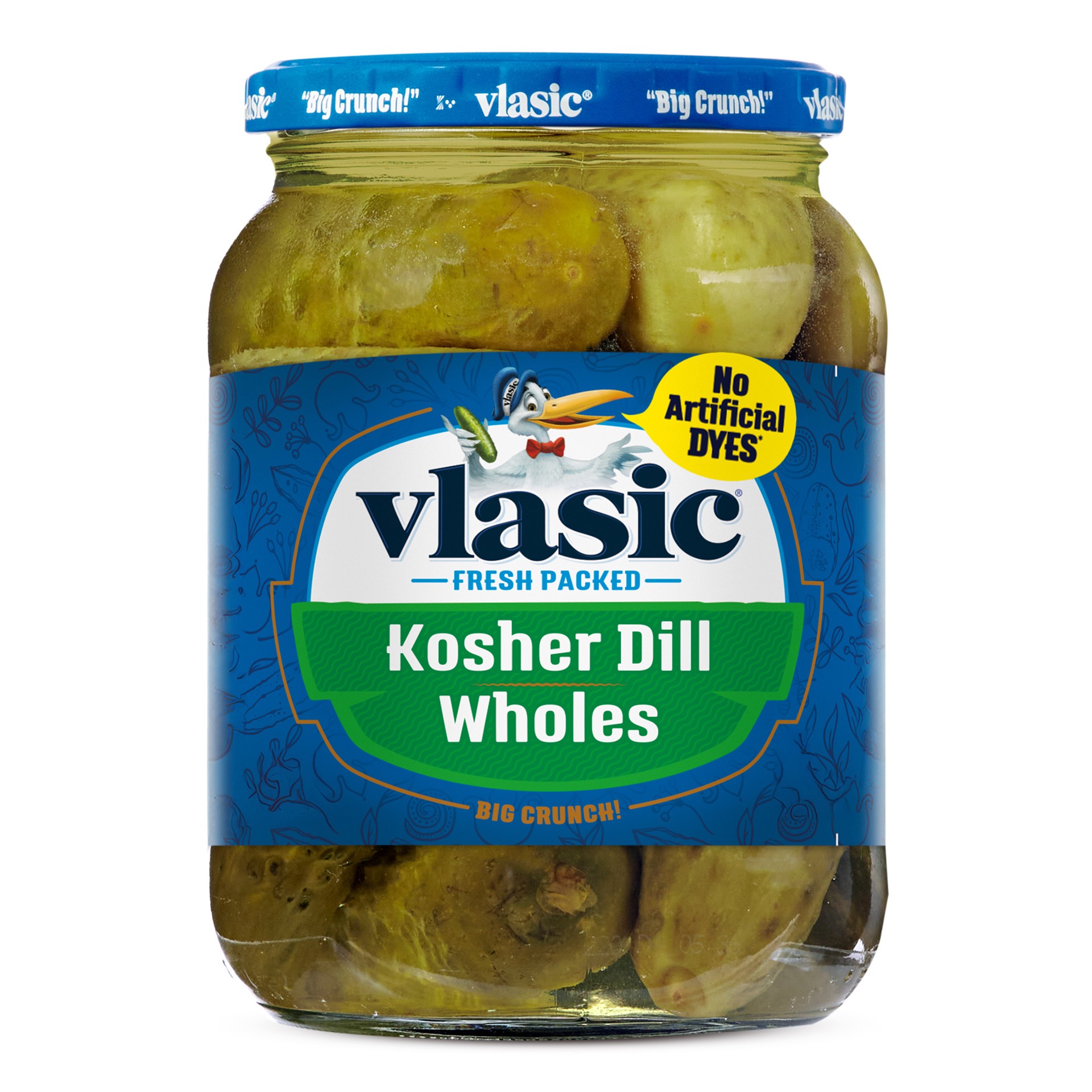 Vlasic Kosher Dill Whole Pickles are deliciously crunchy. All ingredients, along with the Vlasic secret pickling recipe, make these Kosher dill pickles tasty. These snack pickles contain 0 calories pe…