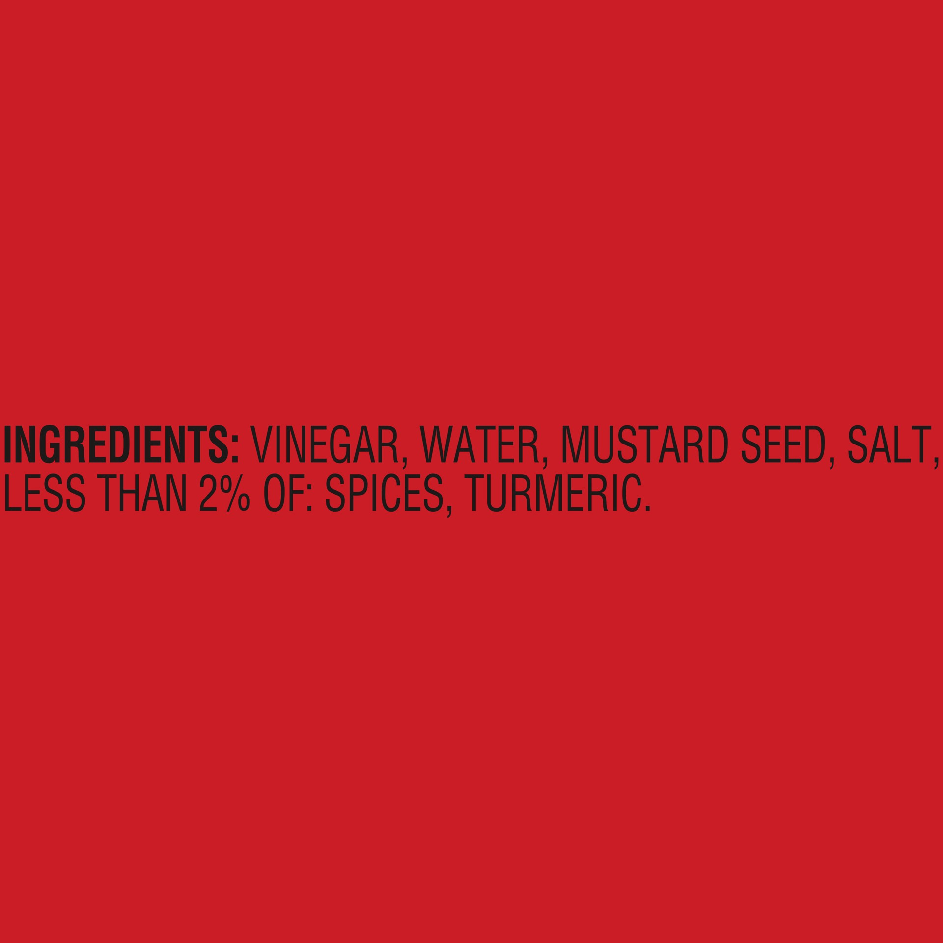 Organic Vinegar, Water, Mustard Seed, Salt, Less than 2% of: Spices, Turmeric.