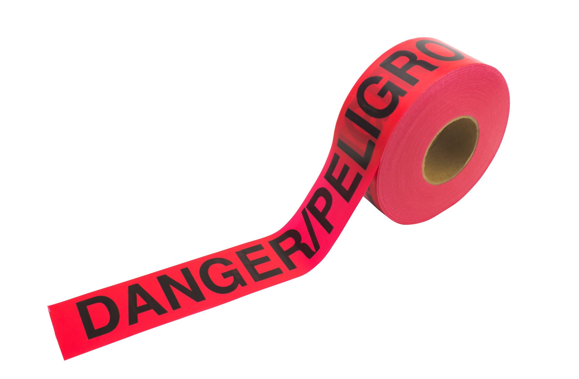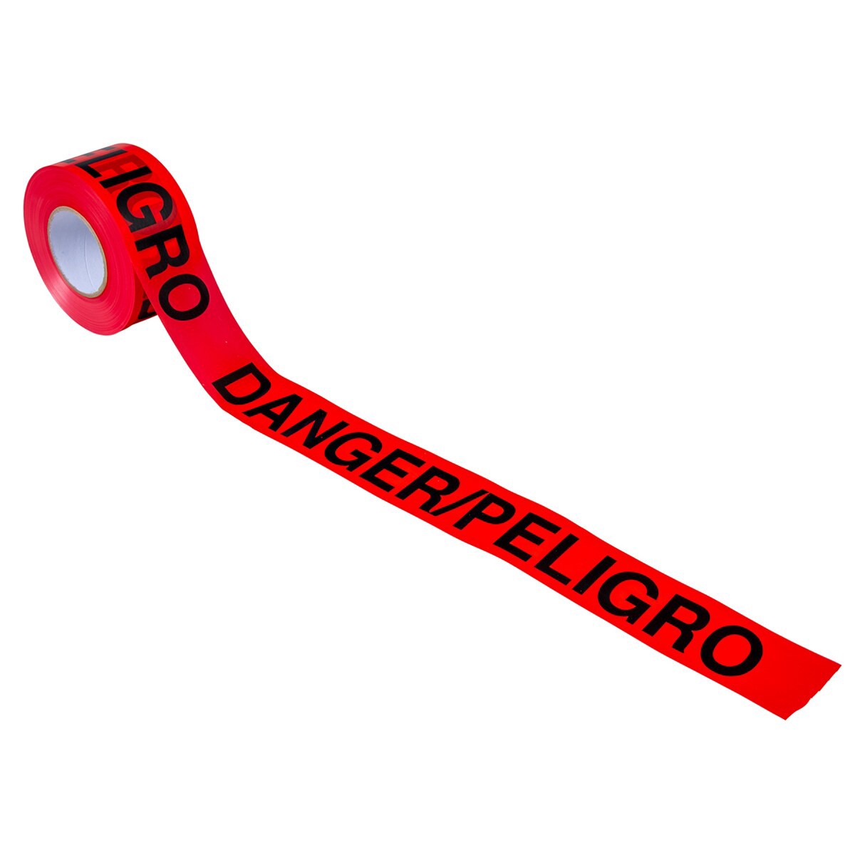 Danger/peligro repeated in capital, bold letters. Strong, 2 mil thick. 1000 Ft long. Red color for high visibility.