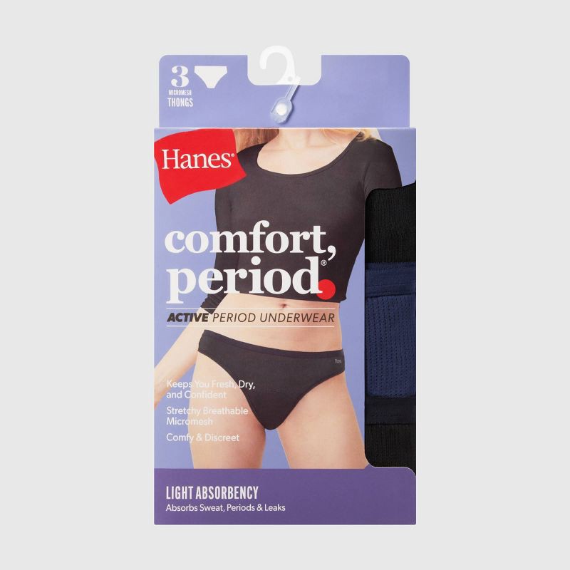 Stay confident and comfortable through every move with Hanes Comfort, Period.™ Light Absorbency Thong Underwear, designed for women who want protection without compromise. Perfect for light period day…