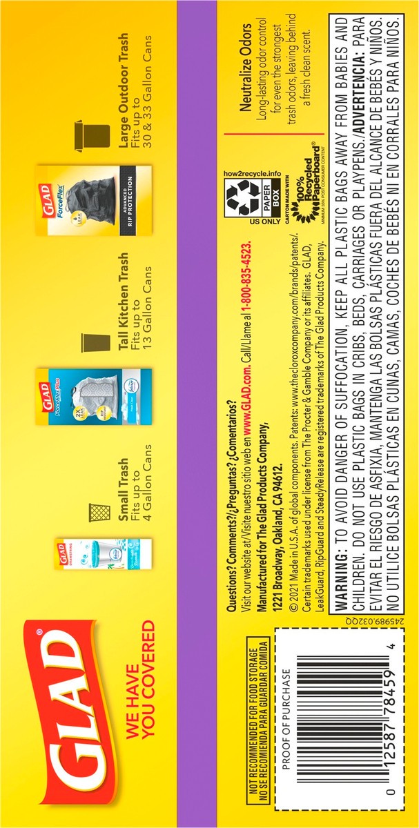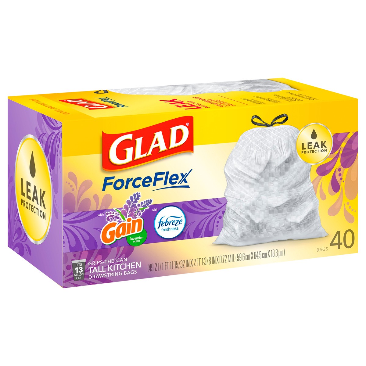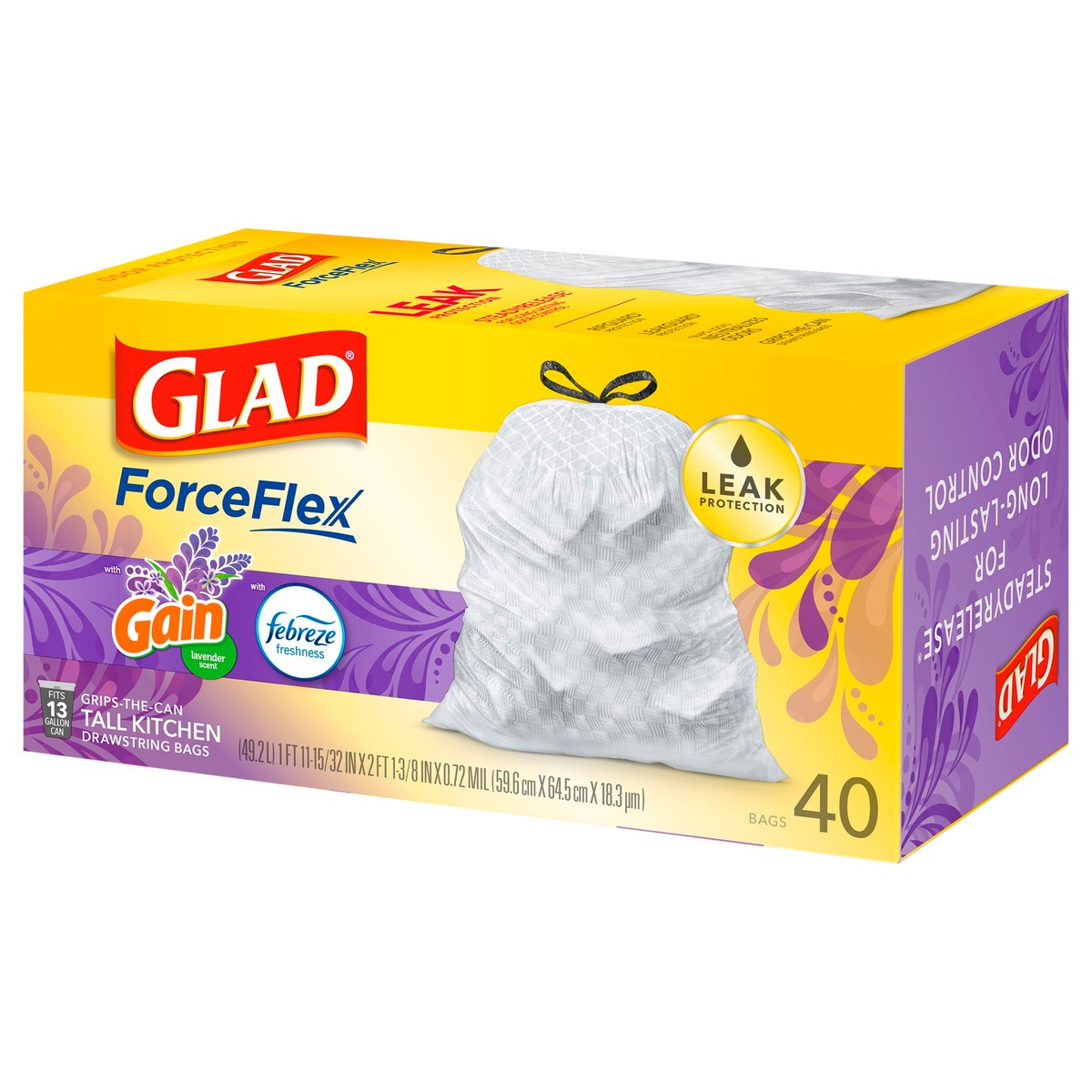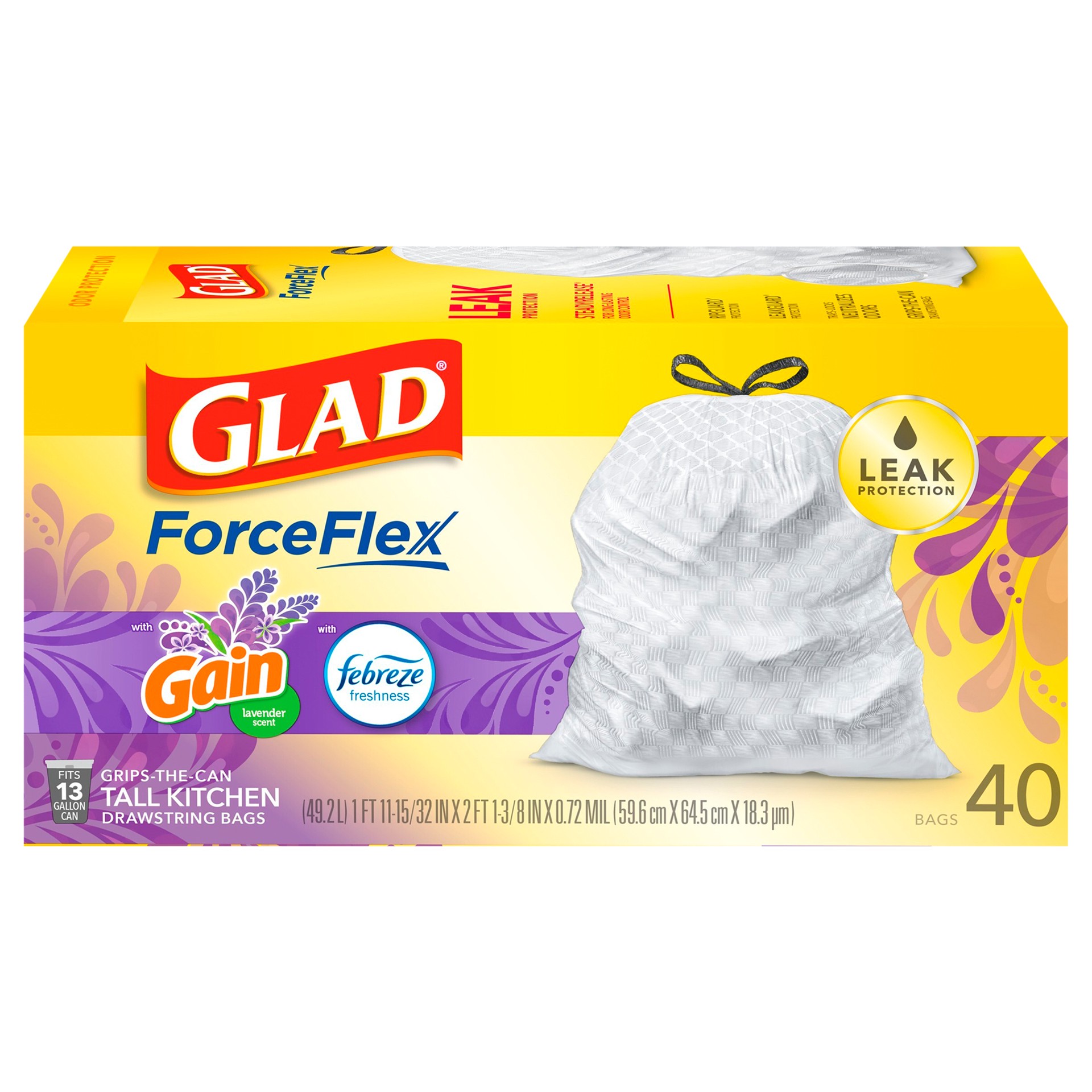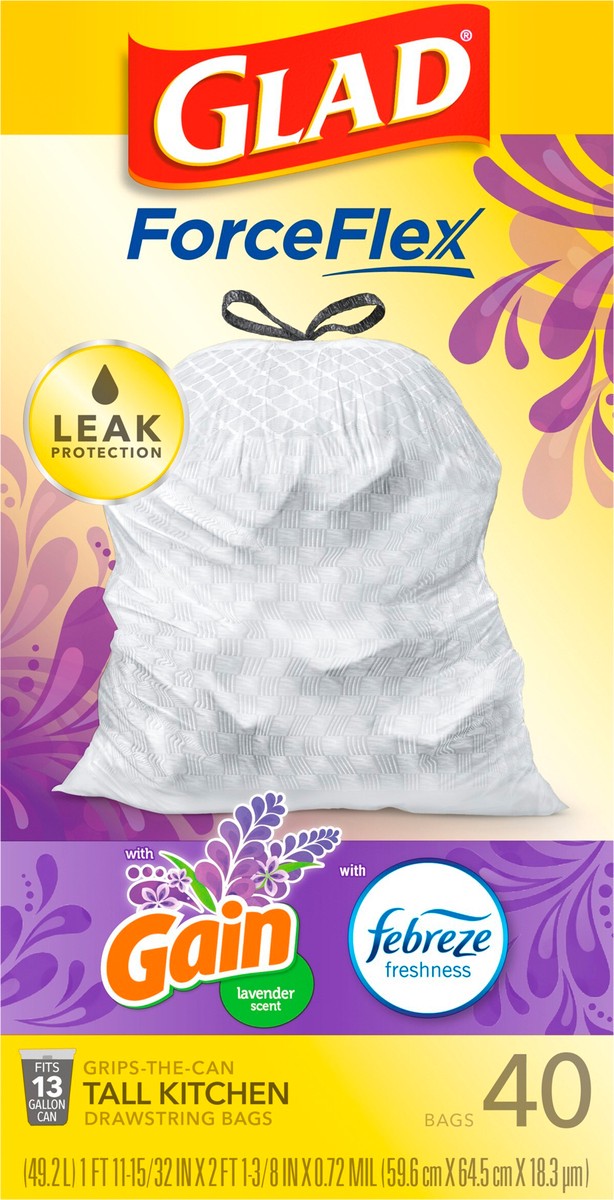 Glad Forceflex Tall Kitchen Trash Bags - Gain Lavender With Febreze 40 Count - 13 Gallon