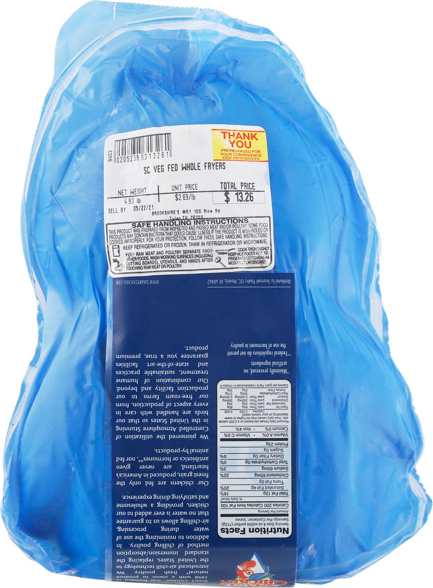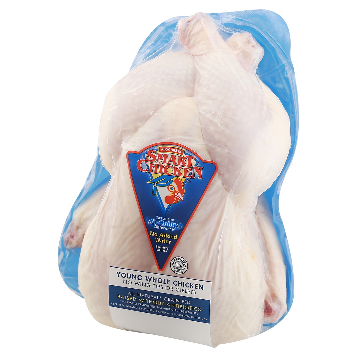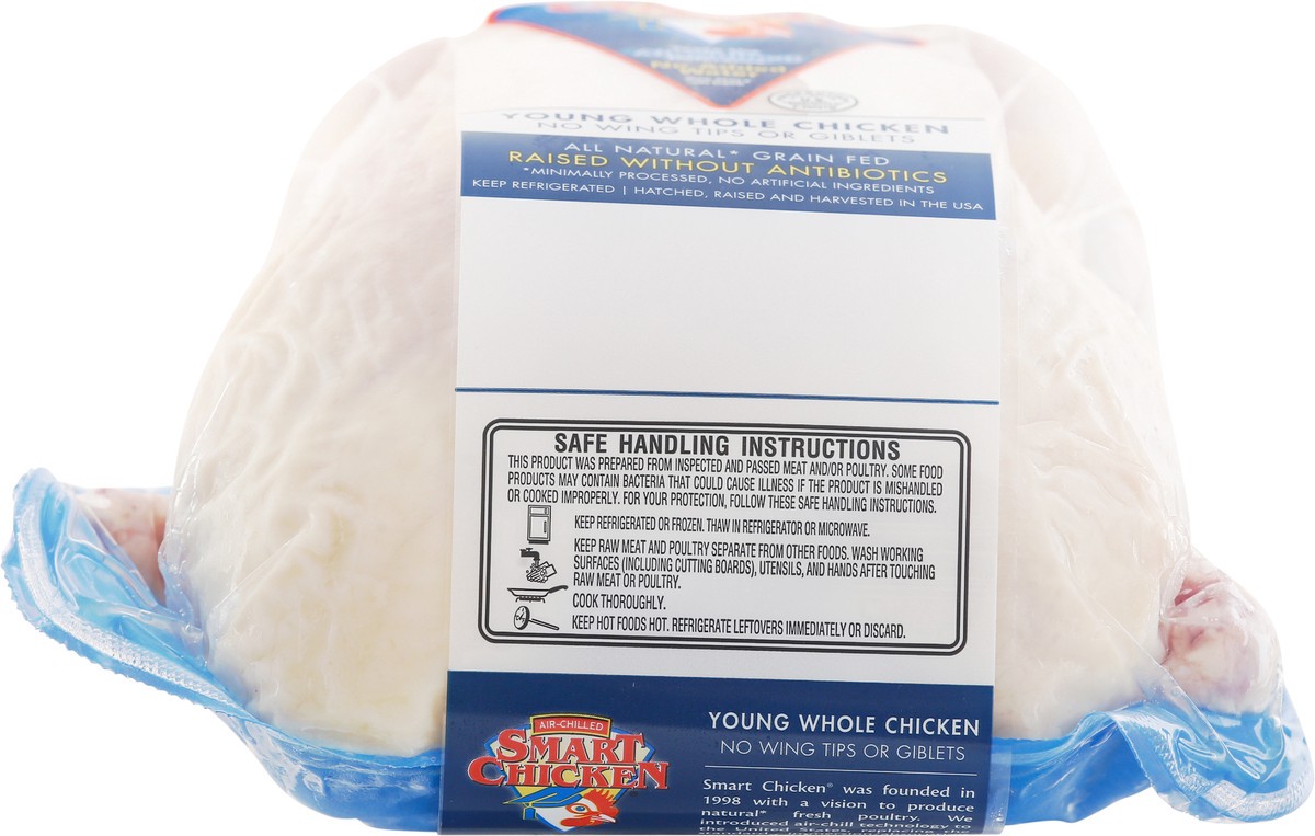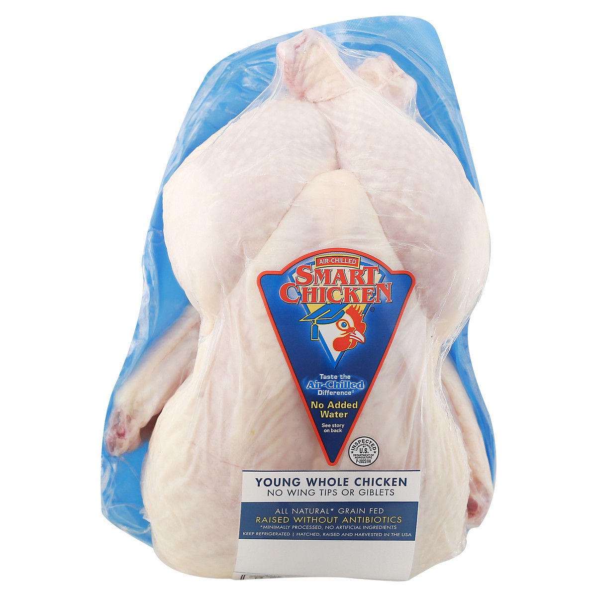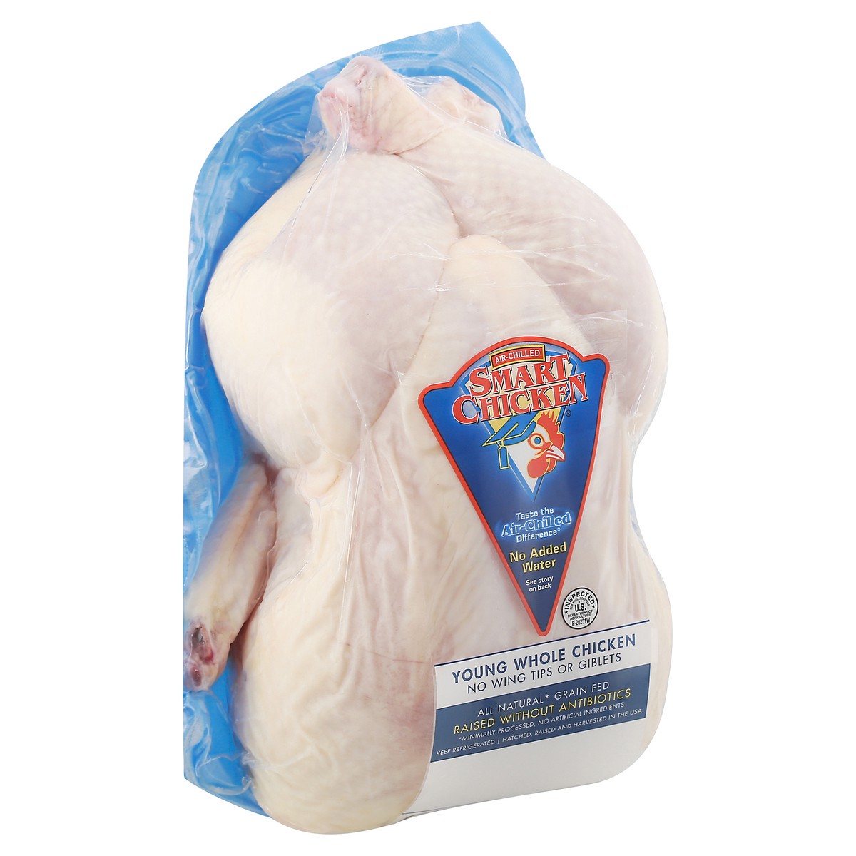 Young whole chicken no wings tips or giblets. Air-chilled. Taste the air chilled difference. No added water. See story on back. All natural (minimally processed) grain fed raised without antibiotics. …