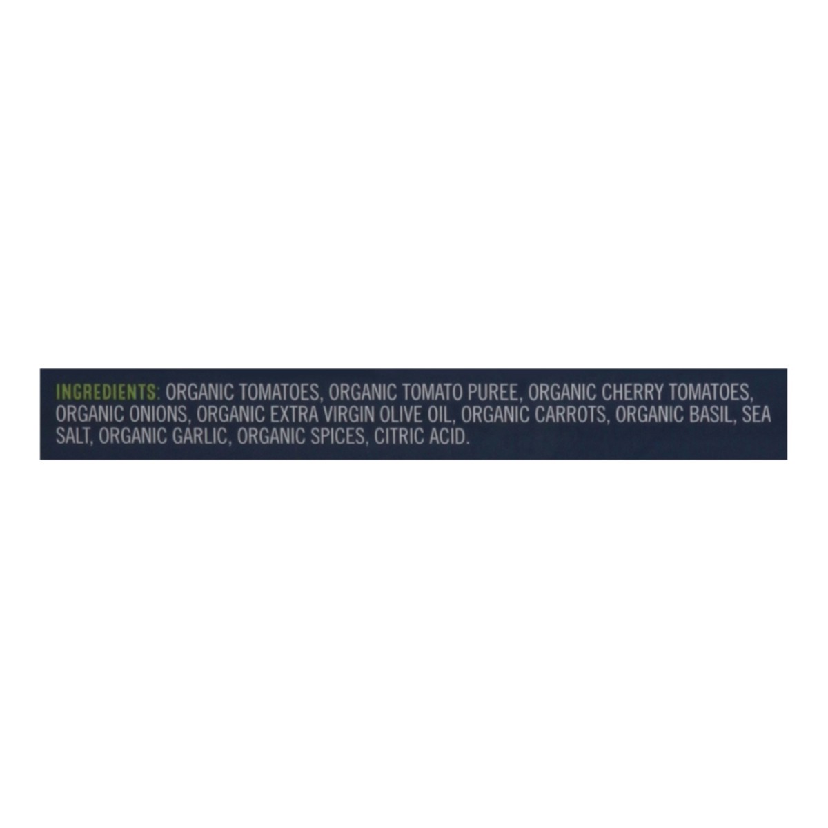 Organic Tomatoes, Organic Tomato Puree, Organic Cherry Tomatoes, Organic Onions, Organic Extra Virgin Olive Oil, Organic Carrots, Organic Basil, Sea Salt, Organic Garlic, Organic Spices, Citric Acid.