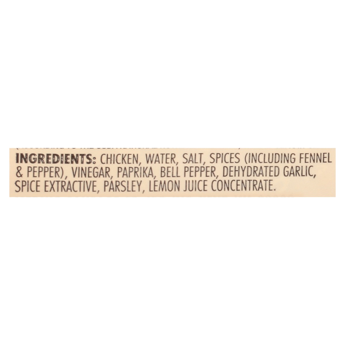 Chicken, Water, Salt, Spices (Including Fennel & Pepper), Vinegar, Papri̇Ka, Bell Pepper, Dehydrated Garlic, Spice Extractive, Parsley, Lemon Juice Concentrate.