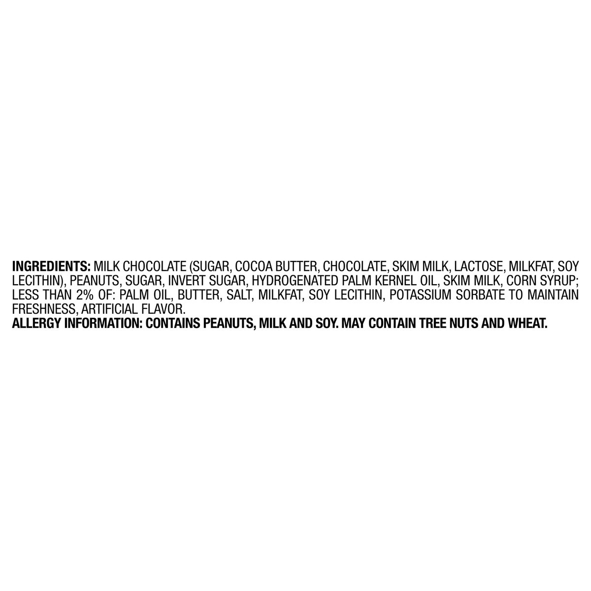 MILK CHOCOLATE (SUGAR, COCOA BUTTER, CHOCOLATE, SKIM MILK, LACTOSE, MILKFAT, SOY LECITHIN), PEANUTS, SUGAR, INVERT SUGAR, HYDROGENATED PALM KERNEL OIL, SKIM MILK, CORN SYRUP; LESS THAN 2% OF: PALM OIL…