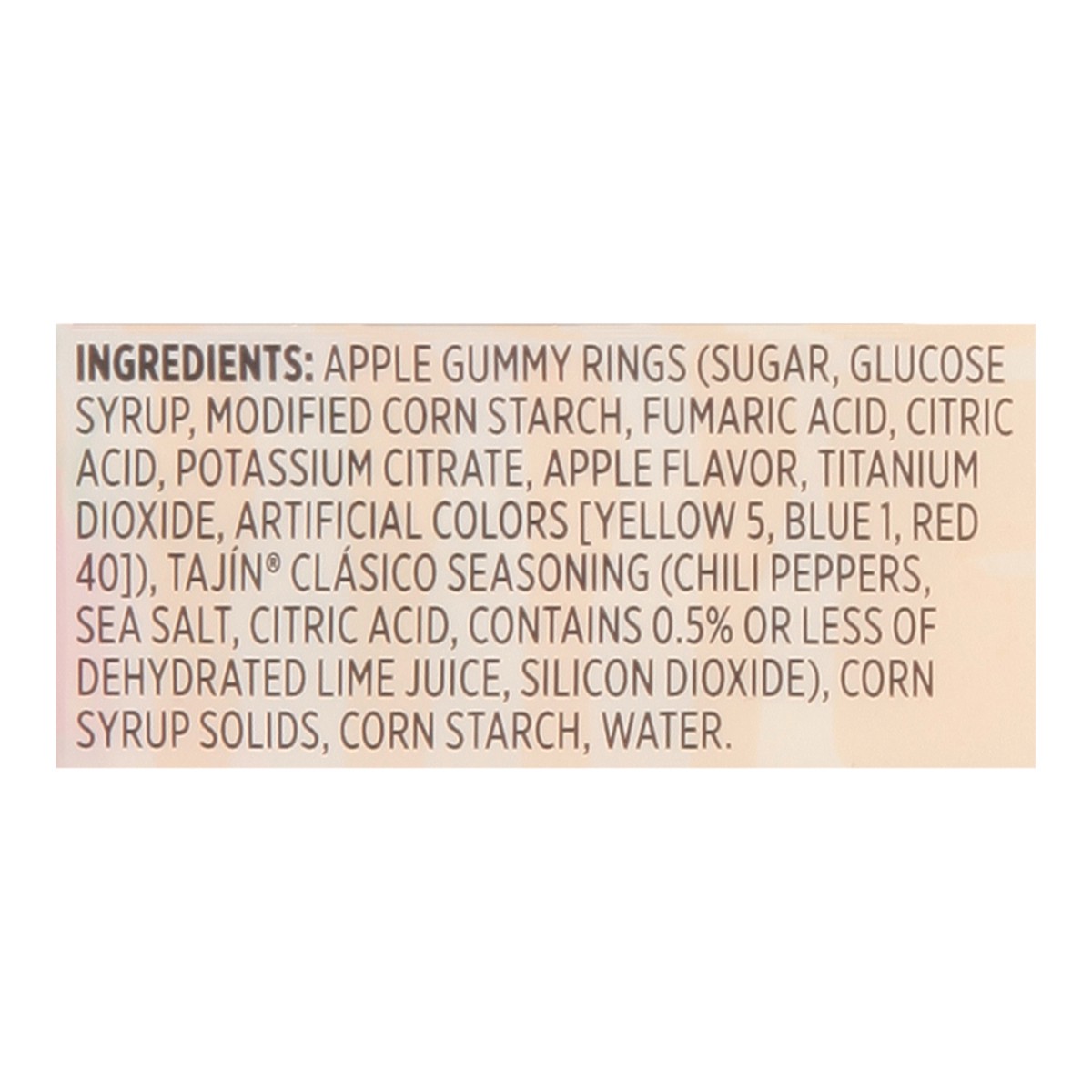 Apple Gummy Rings (Sugar, Glucose Syrup, Modified Corn Starch, Fumaric Acid, Citric Acid, Potassium Citrate, Apple Flavor, Titanium Dioxide, Artificial Colors [Yellow 5, Blue 1, Red 40]), Tajin Clasic…