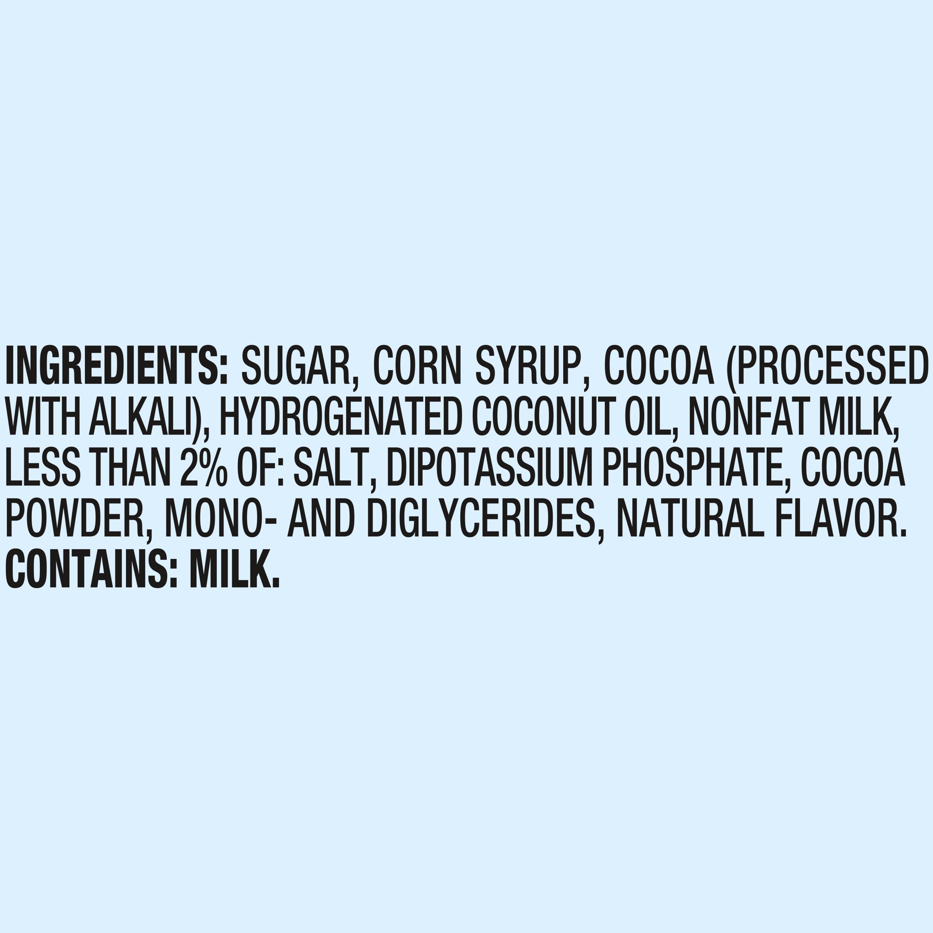 Sugar, Corn Syrup, Cocoa (Processed with Alkali), Hydrogenated Coconut Oil, Nonfat Milk, Less Than 2% Of: Salt, Dipotassium Phosphate, Cocoa Powder, Mono- and Diglycerides, Natural Flavor. CONTAINS: M…