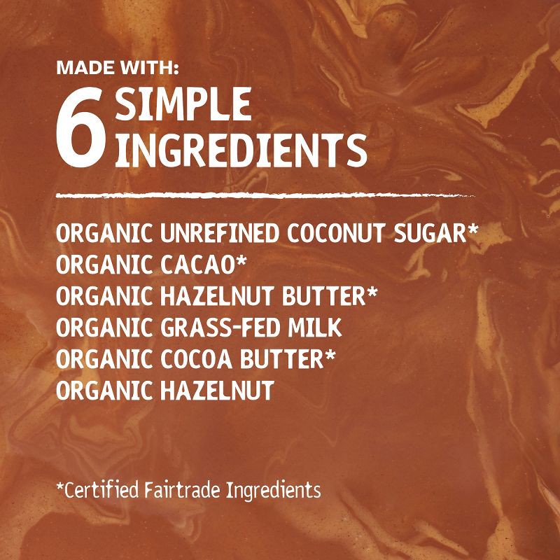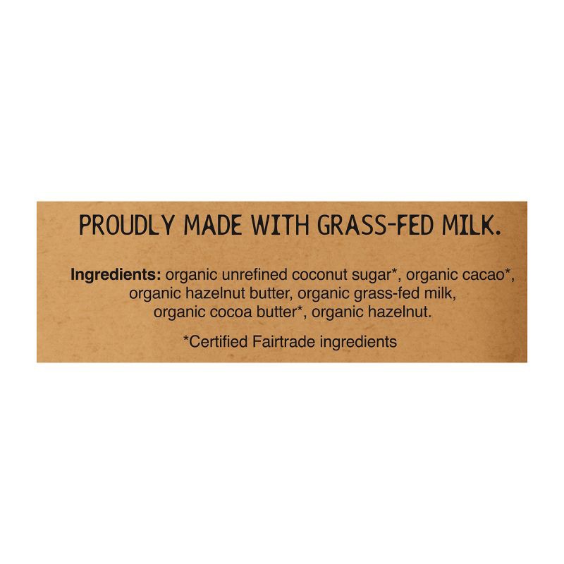 Organic Unrefined Coconut Sugar*, Organic Cacao*, Organic Hazelnut Butter, Organic Grass-Fed Milk, Organic Cocoa Butter*, Organic Hazelnut. * Certified Fairtrade Ingredients.
