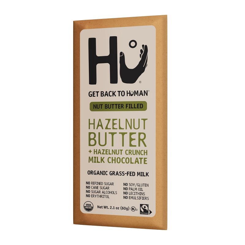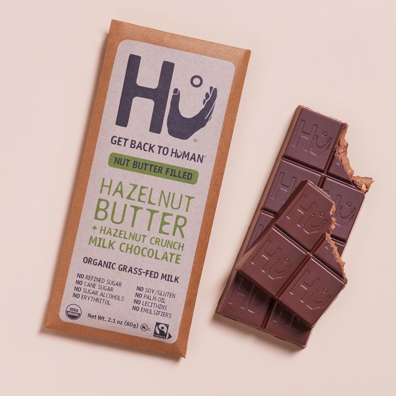 - HAZELNUT BUTTER + HAZELNUT CRUNCH MILK CHOCOLATE: Hazelnut overload in the best way possible. Hazelnut butter (made the Hu way) with chopped hazelnut pieces for that perfect crunch. It's the day-making kind of decadence