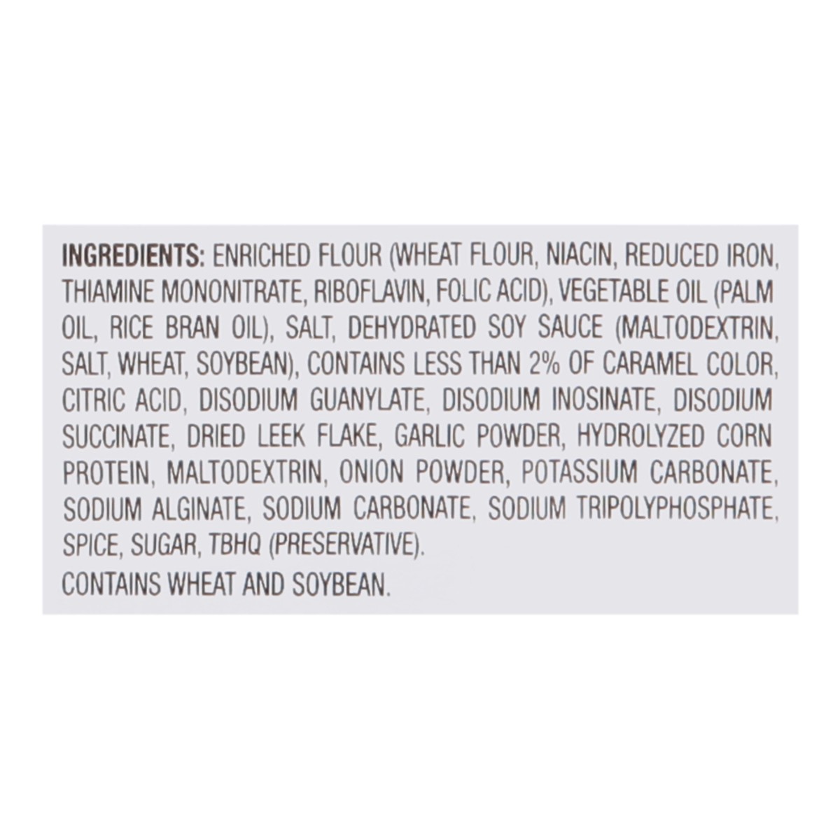 Enriched Flour (Wheat Flour, Niacin, Reduced Iron, Thiamine Mononitrate, Riboflavin, Folic Acid), Vegetable Oil (Palm Oil, Rice Bran Oil), Salt, Dehydrated Soy Sauce (Maltodextrin, Salt, Wheat, Soybea…
