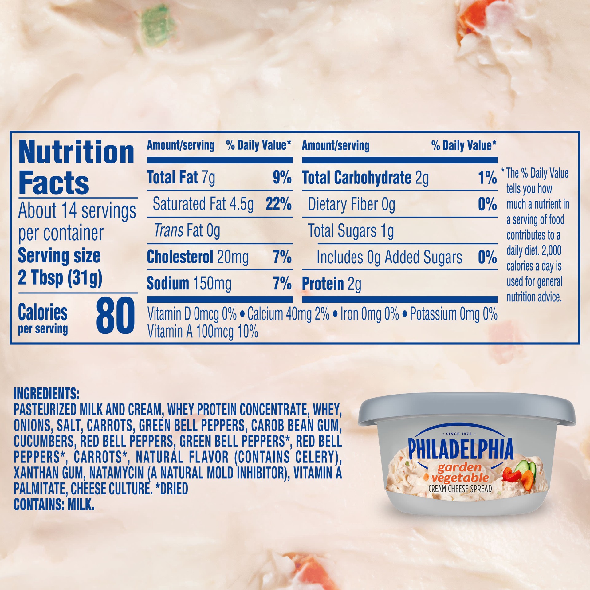 Dive into immersive pleasure with Philadelphia Garden Vegetable Cream Cheese Spread. Made with fresh milk, real cream, cucumbers, red bell peppers, green bell peppers and carrots for an extra creamy, …