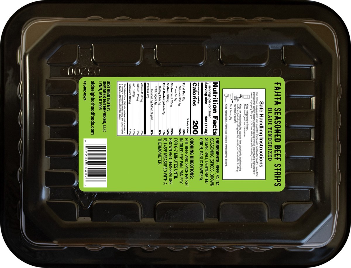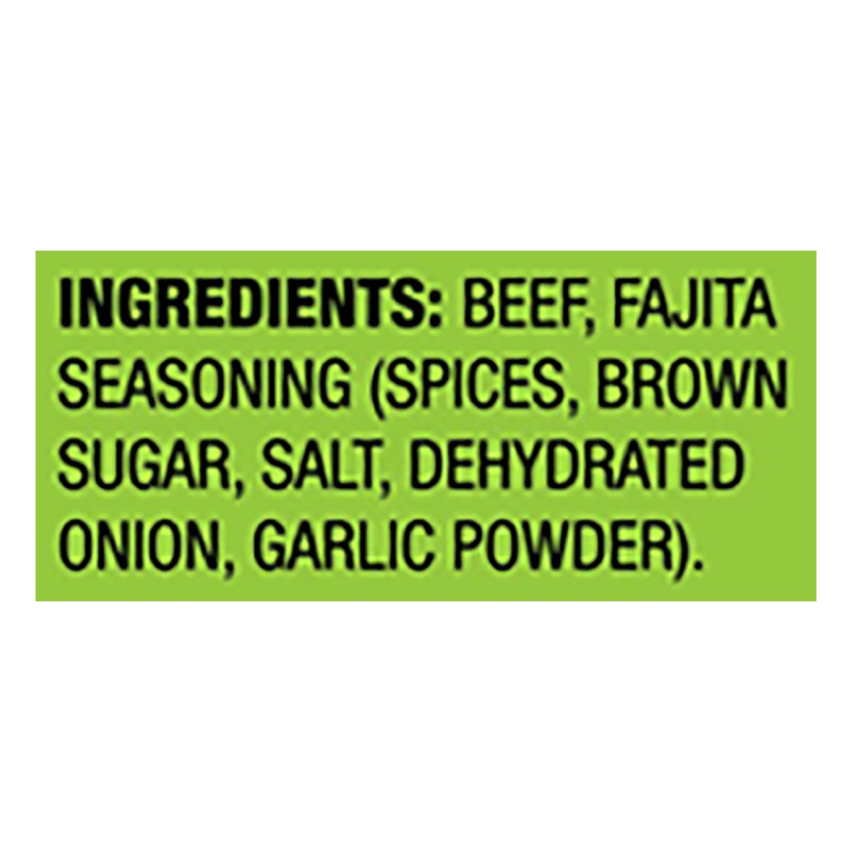 Beef, Fajita Seasoning (Spices, Brown Sugar, Salt, Dehydrated Onion, Garlic Powder).