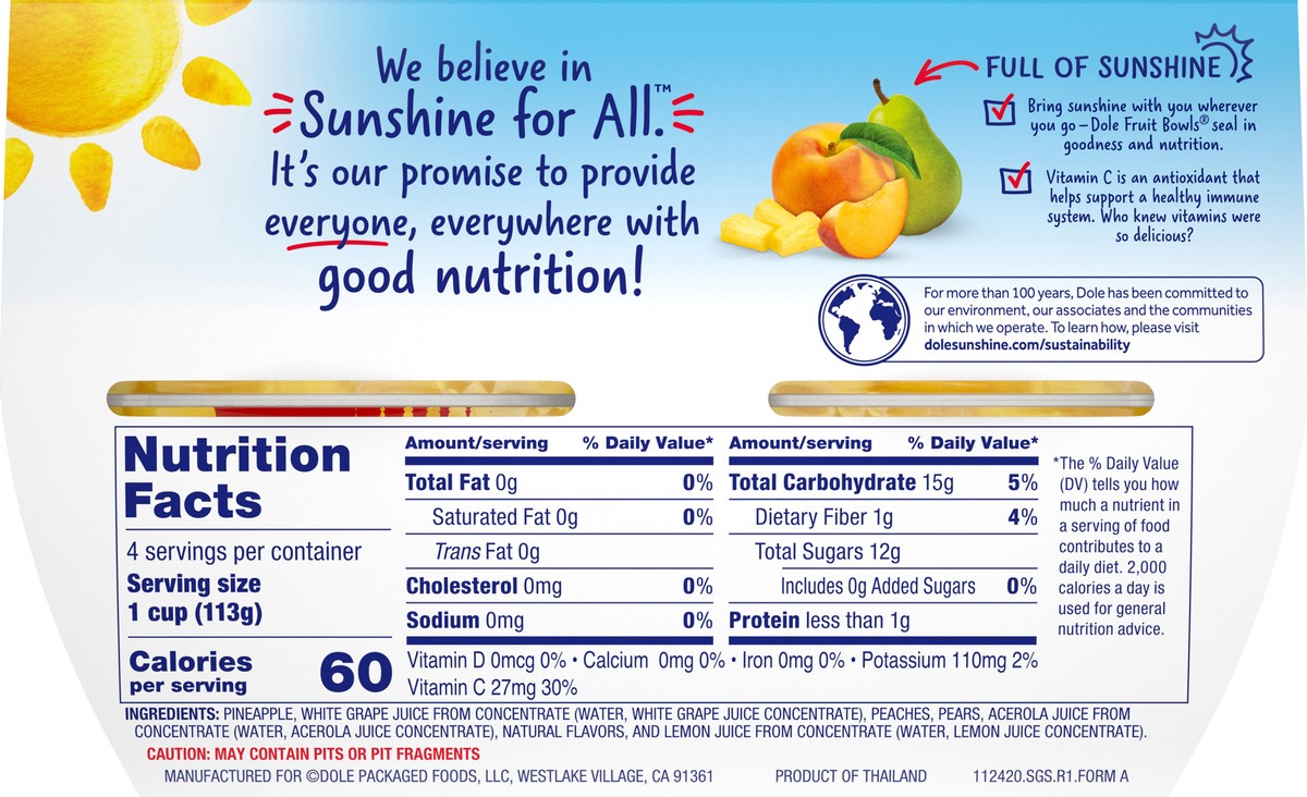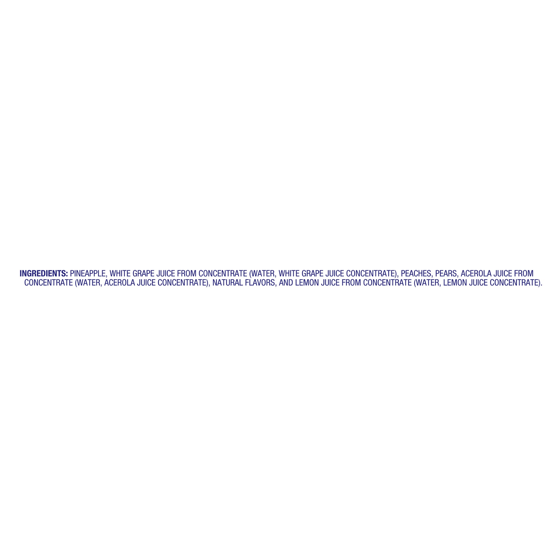 Pineapple, White Grape Juice from Concentrate (Water, White Grape Juice Concentrate), Peaches, Pears, Acerola Juice from Concentrate (Water, Acerola Juice Concentrate), Natural Flavors, and Lemon Juic…