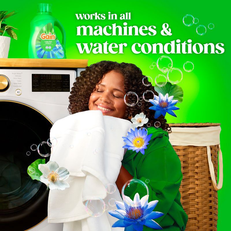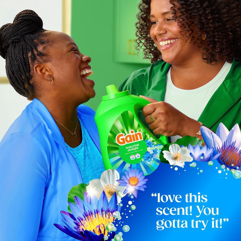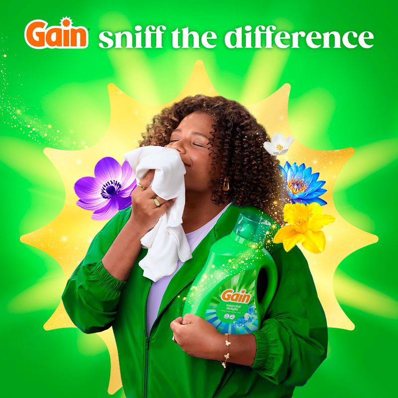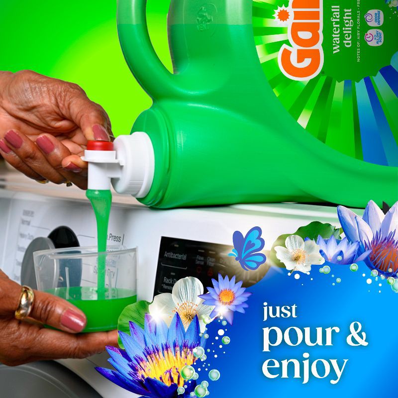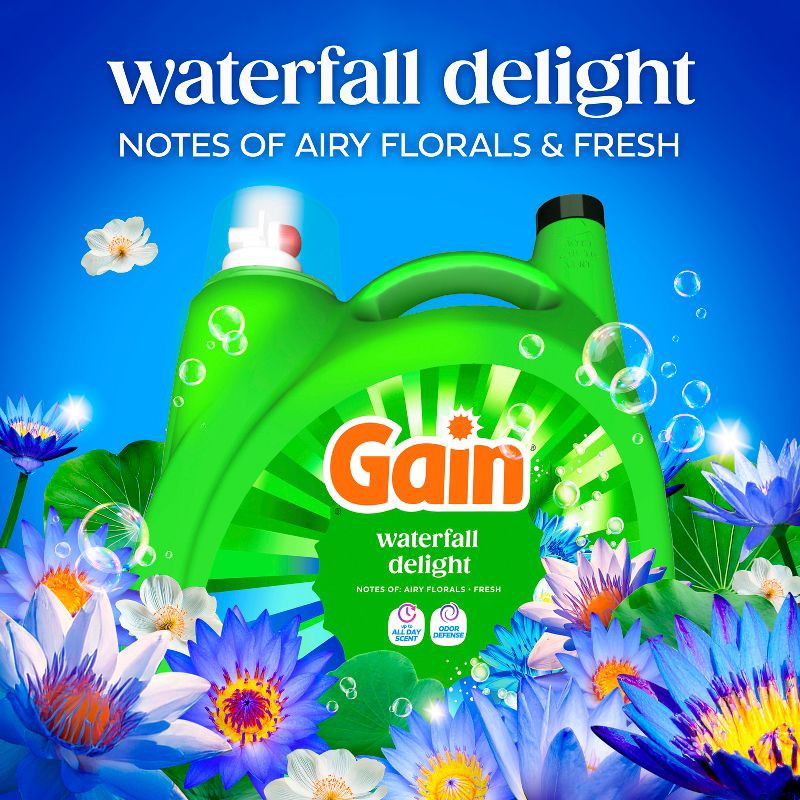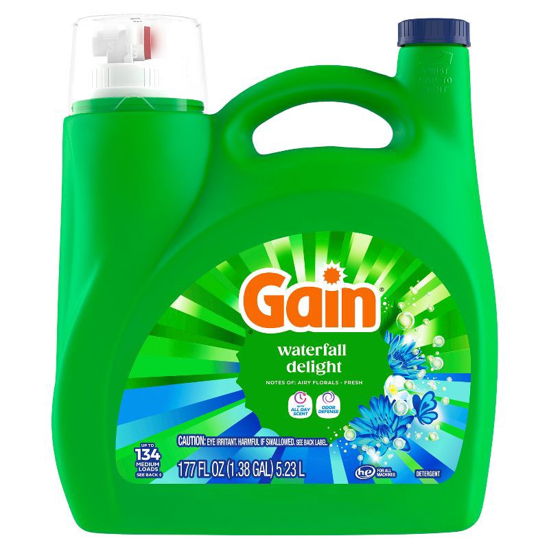 - PACKAGE CONTENTS: Includes one jug of 177 fl oz of Gain Liquid Laundry Detergent in Waterfall Delight Scent, Now with Odor Defense, good for 134 Medium Loads