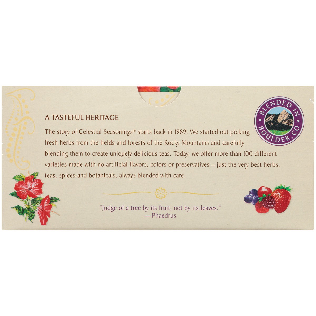 Hibiscus, Rosehips, Roasted Chicory, Orange Peel, Blackberry Leaves, Natural Flavors of Black Raspberries, Strawberries, Blueberries, Red Raspberries, Cranberries and Cherries with Other Natural Flavo…
