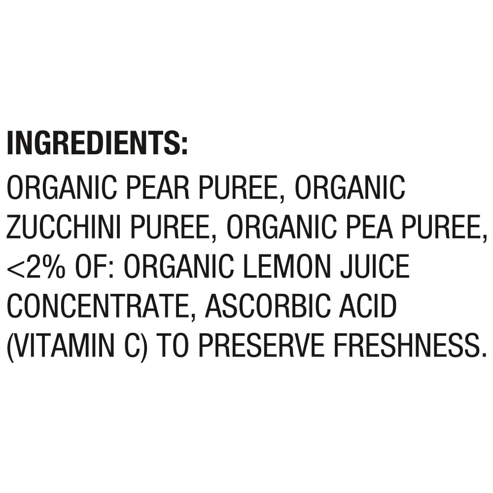 Ingredients: Organic Pear Puree, Organic Zucchini Puree, Organic Pea Puree, <1% Of: Ascorbic Acid (Vitamin C) To Preserve Freshness, Organic Lemon Juice Concentrate