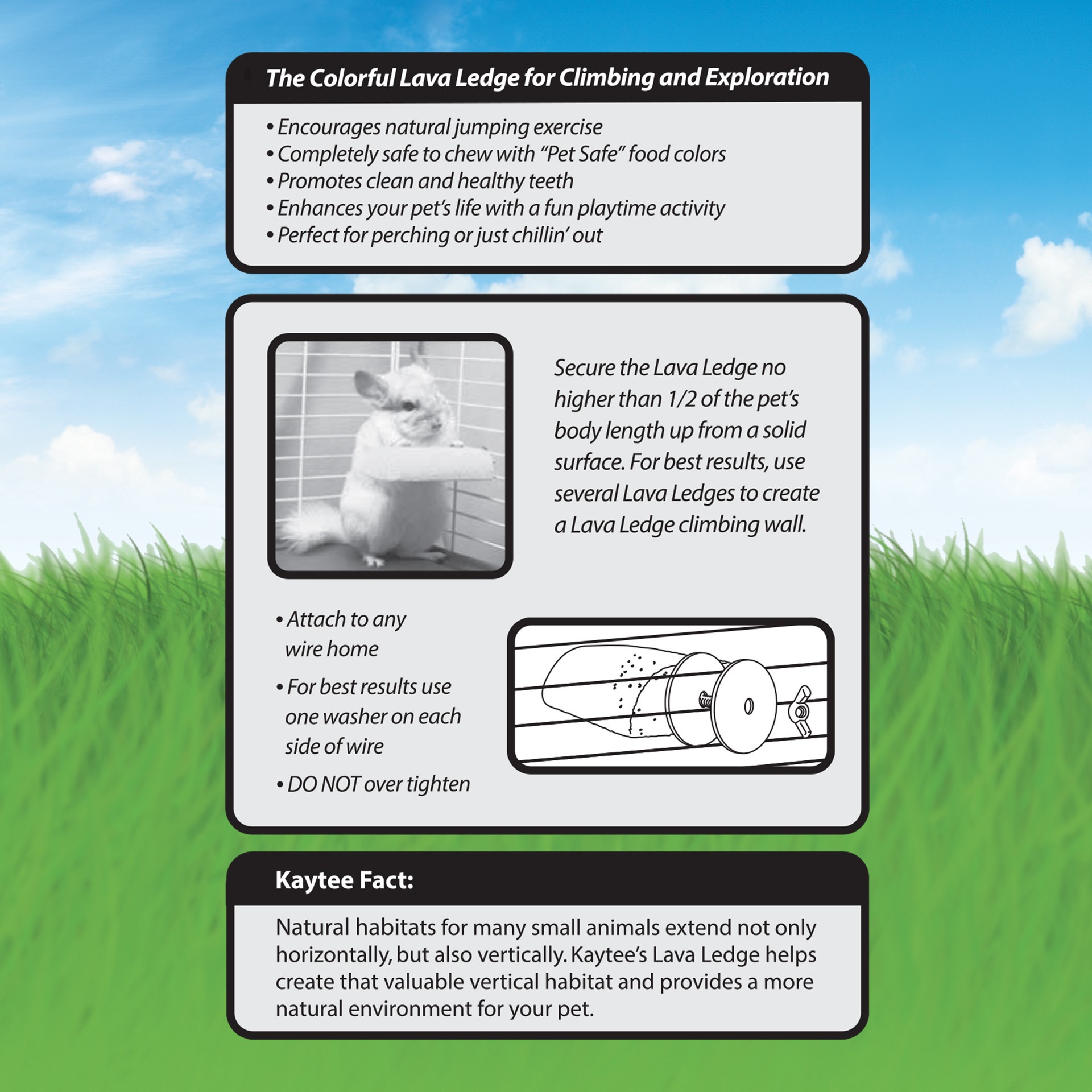 The Kaytee Lava Ledge is perfect for chinchillas and encourages natural jumping exercises. Made of pumice rock and is completely safe to chew and promotes clean and healthy teeth. Easily attaches to a…