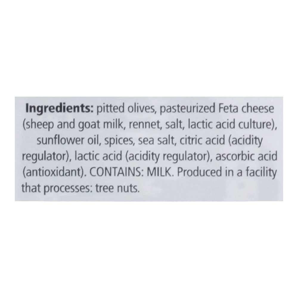 Pitted Olives, Pasteurized Feta Cheese (Sheep and Goat Milk, Rennet, Salt, Lactic Acid Culture), Sunflower Oil, Spices, Sea Salt, Citric Acid (Acidity Regulator), Lactic Acid (Acidity Regulator), Asco…