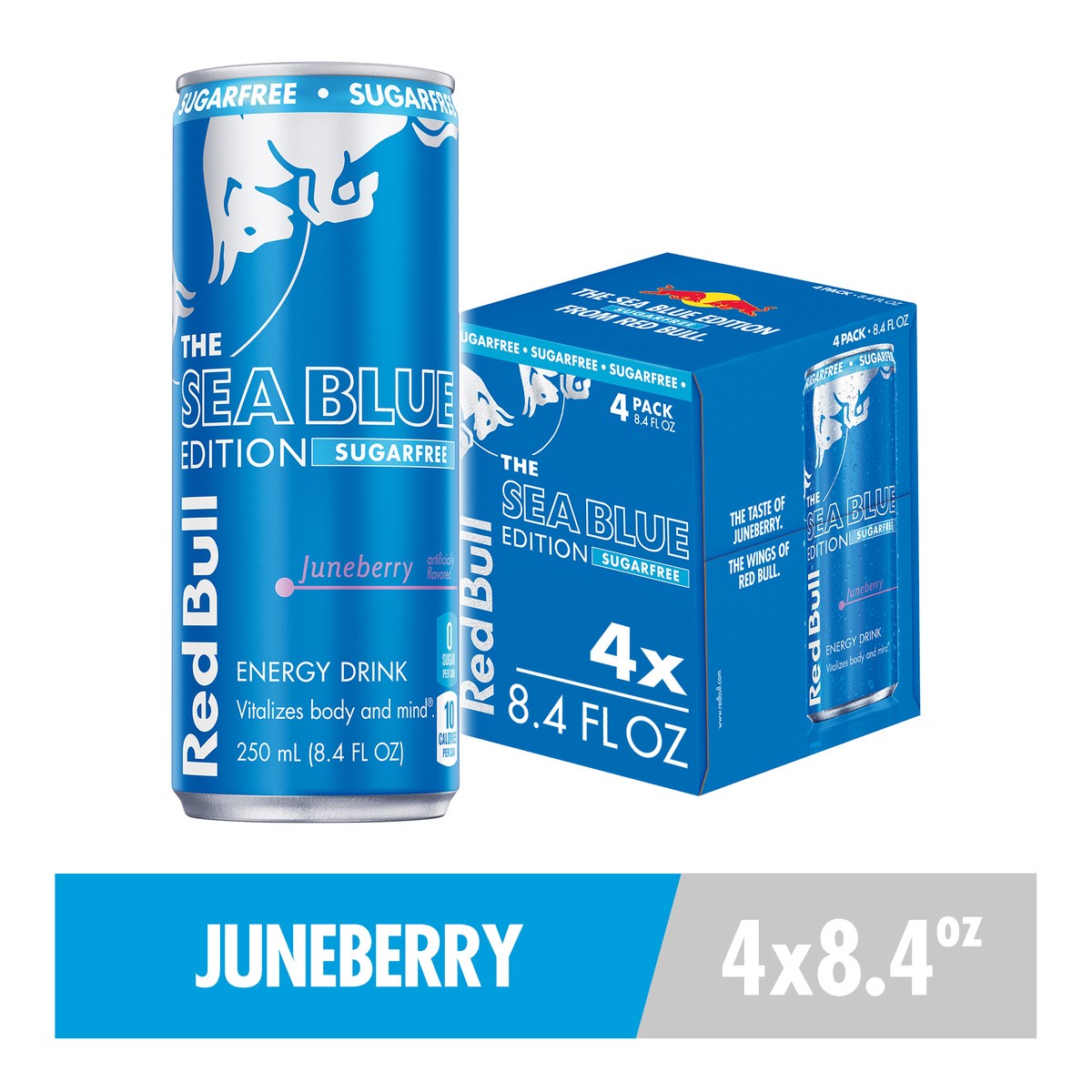 Red Bull Sea Blue Edition Sugar Free Energy Drink, Juneberry, 8.4 fl. oz., Pack of 4 cans, with 80mg Caffeine, Taurine & B Vitamins
