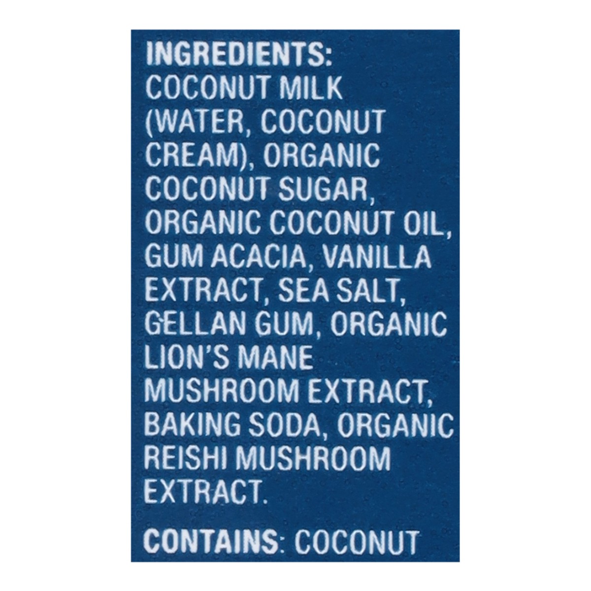 Coconut Milk (Water, Coconut Cream), Organic Coconut Sugar, Organic Coconut Oil, Gum Acacia, Vanilla Extract, Sea Salt, Gellan Gum, Organic Lion's Mane Mushroom Extract, Baking Soda, Organic Reishi Mu…