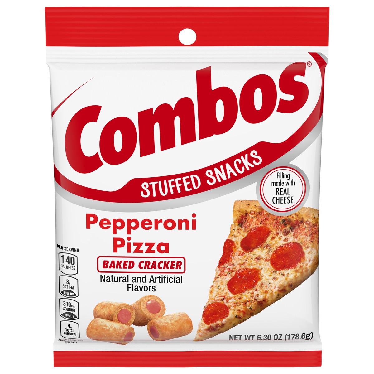 - Contains one (1) 6.3-ounce bag of COMBOS Cheddar Pepperoni Pizza Cracker Baked SnacksCrunchy oven-baked crackers stuffed with real cheese and pepperoni pizza-flavor fillingA satisfying and delicious on-the-go snacksEach individual serving contains 140 calories of delicious stuffed cracker snacksPack a delicious baked snack in your lunch