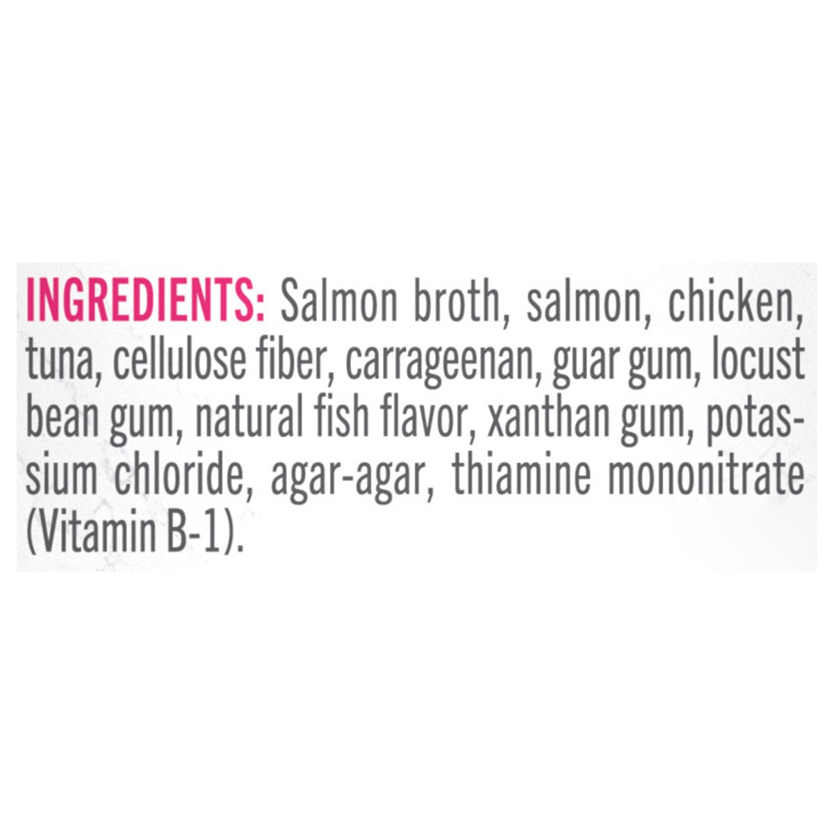 Salmon Broth, Salmon, Chicken, Tuna, Cellulose Fiber, Carrageenan, Guar Gum, Locust Bean Gum, Natural Fish Flavor, Xanthan Gum, Potassium Chloride, Agar-Agar, Thiamine Mononitrate (Vitamin B-1). A5196…