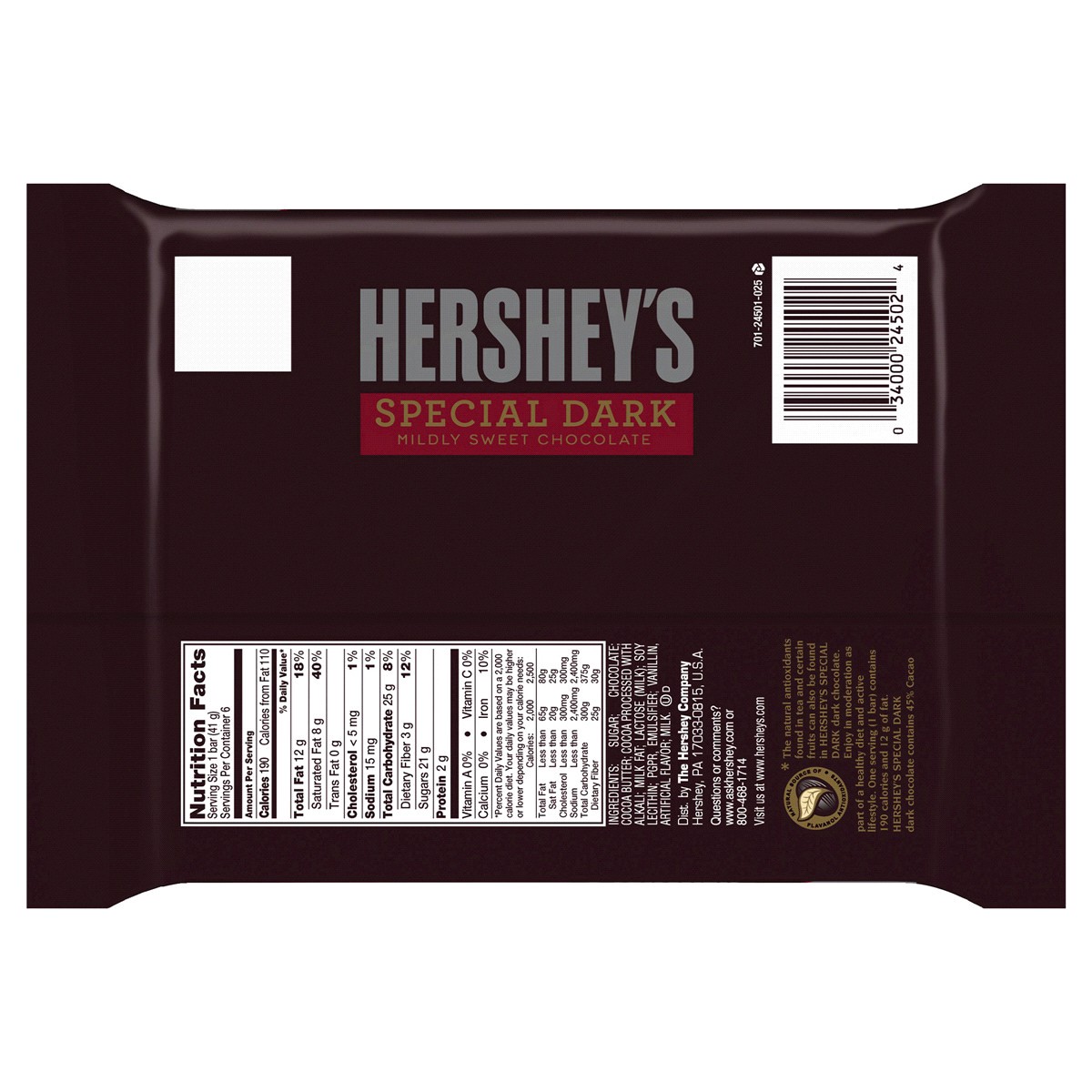 - Contains one (1) 6-count pack of 1.45-ounce HERSHEY''S SPECIAL DARK Mildly Sweet Chocolate Candy Bars