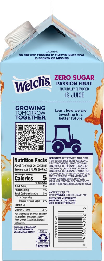 Welch's Refrigerated Zero Sugar Passion Fruit is bursting with the refreshingly bright, vibrant fruit flavors of Passion Fruit. With zero grams of sugar and 20% Daily Value of Vitamin C, per serving, …
