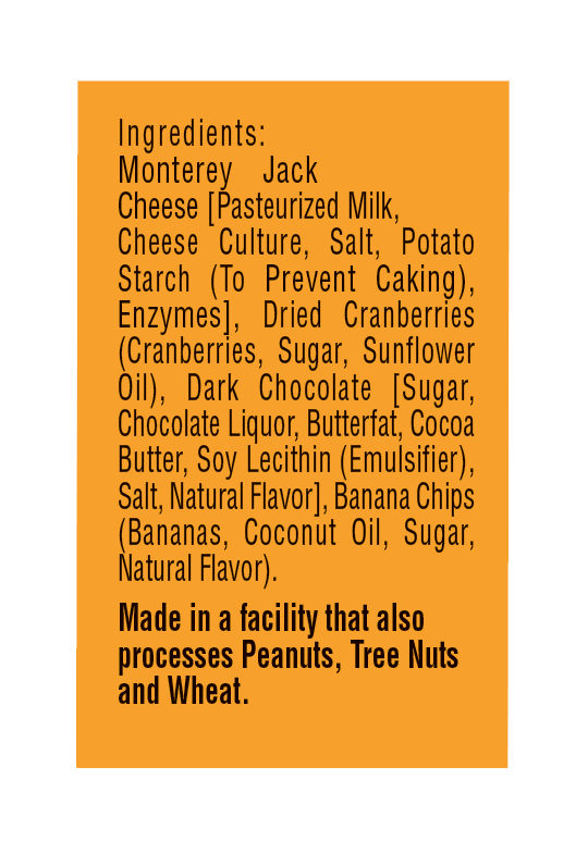 Monterey Jack Cheese [Pasteurized Milk, Cheese Culture, Salt, Enzymes, Natamycin (A Natural Mold Inhibitor)], Dried Cranberries (Cranberries, Sugar, Sunflower Oil), Dark Chocolate [Sugar, Chocolate Li…